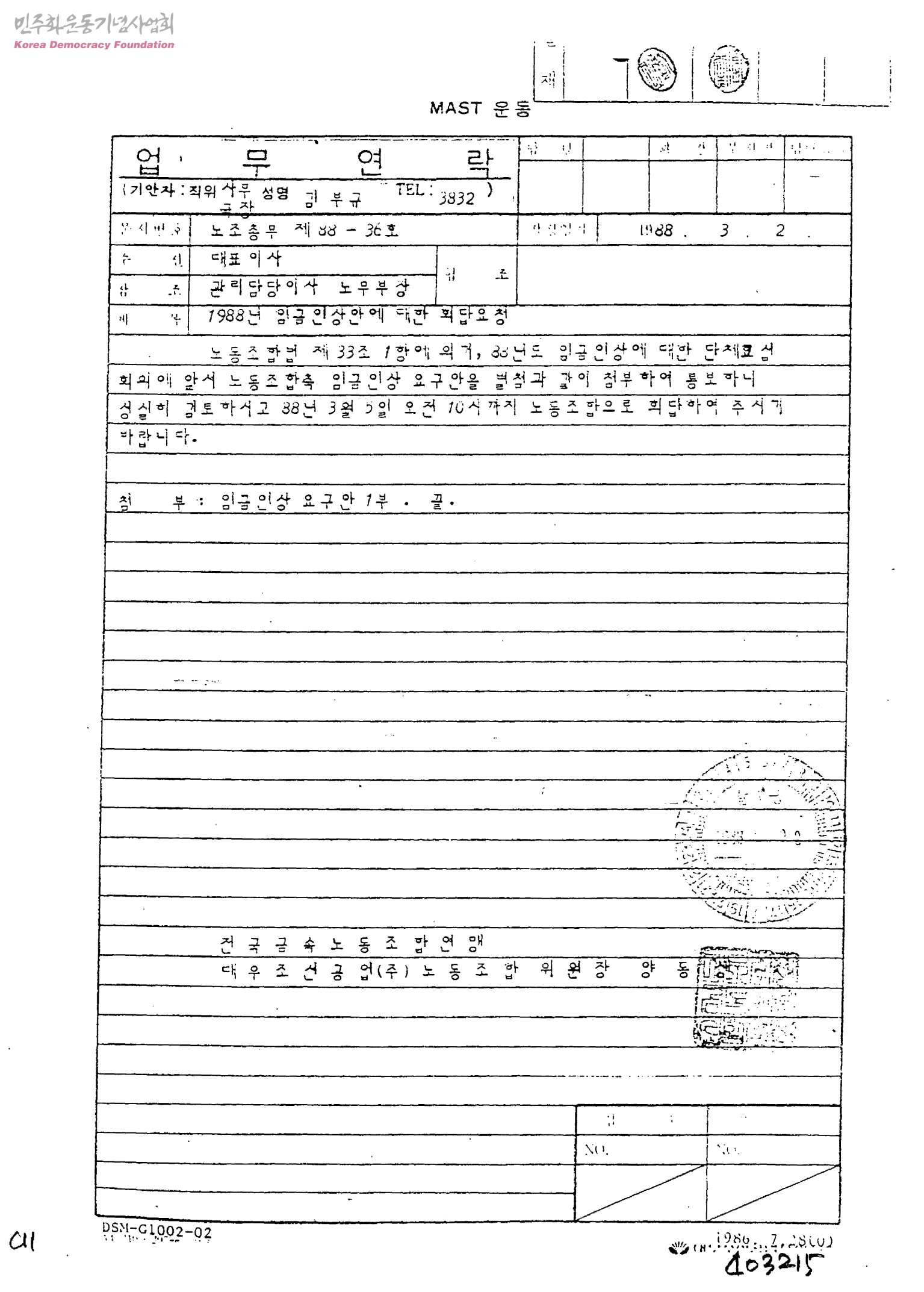 [대우 조선]업무연락-1988년 임금인상안에 대한 회답요청[수신:대표이사, 발신:전국금속노동조합연맹대우조선공업노동조합]