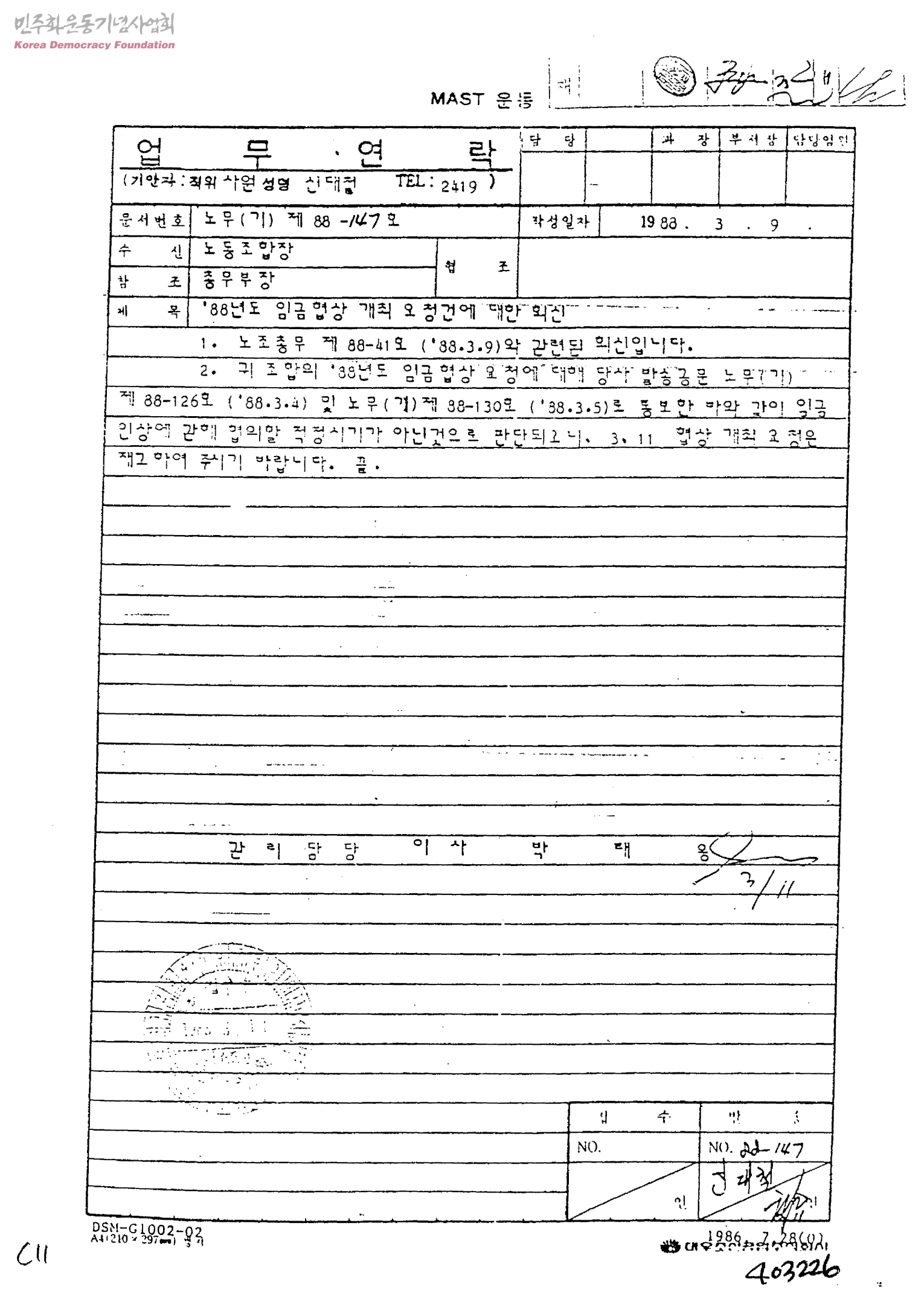 [대우 조선]업무연락-'88년도 임금협상 개최 요청건에 대한 회신[수신:노동조합장, 발신:대우조선공업관리담당이사박태웅]