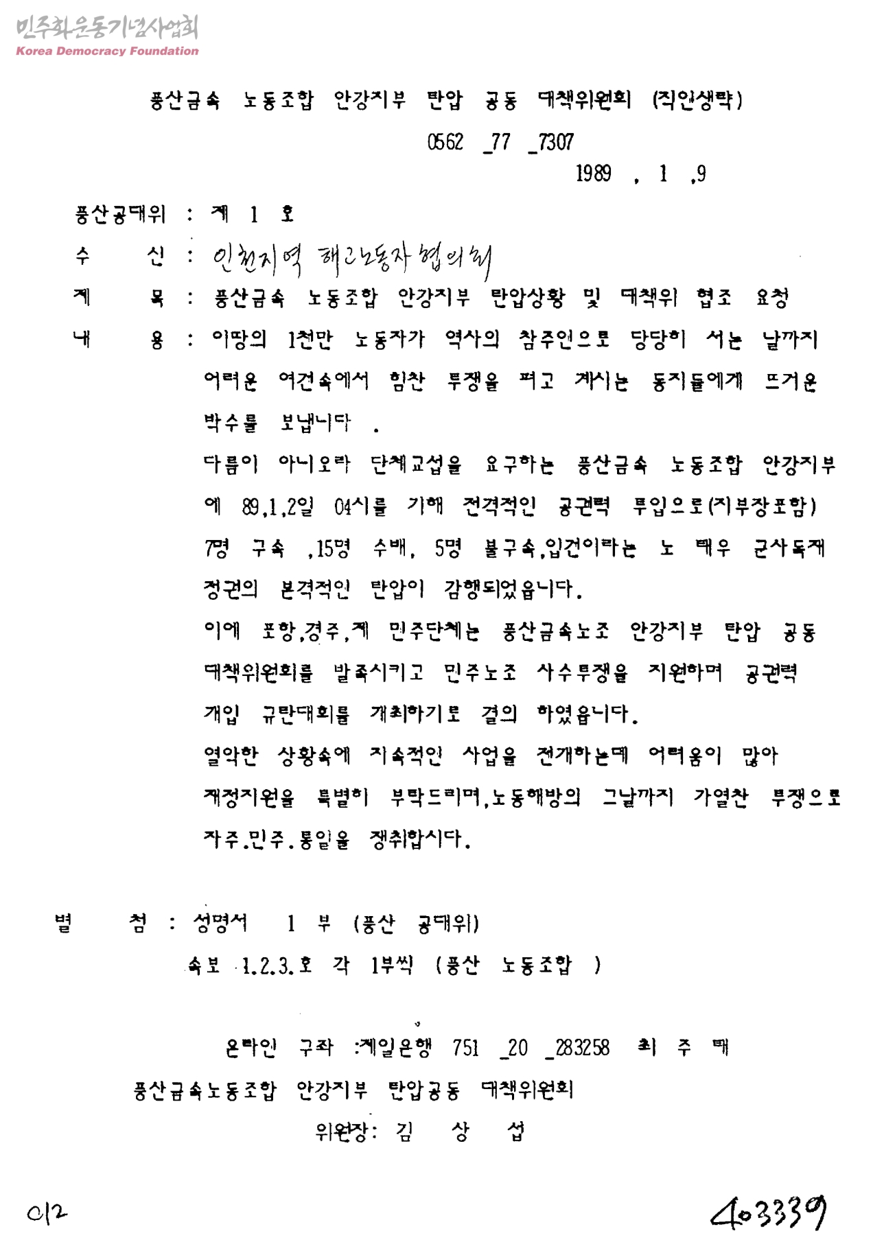 [포항]풍산금속 노동조합 안강지부 탄압상황 및 대책위 협조 요청[수신:인천지역해고노동자협의회, 발신:풍산금속노동조합안강지부탄압공동대책위원회]