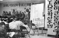 - -시급 200원 일률 인상하라! -상여금 400% 지급하라! -강제잔업 철폐하라!