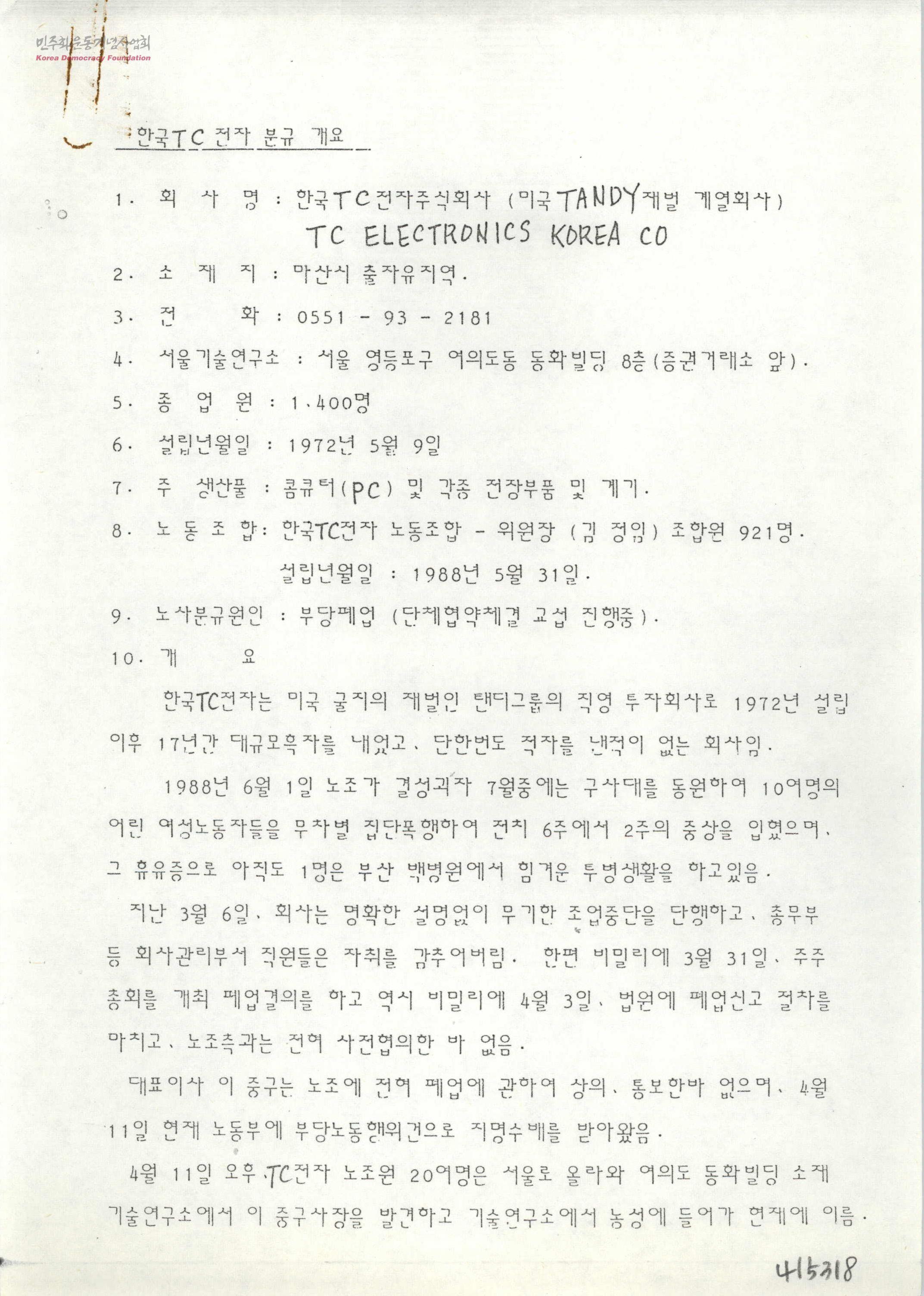 [한국 TC전자 분규 개요 및 분규내용]