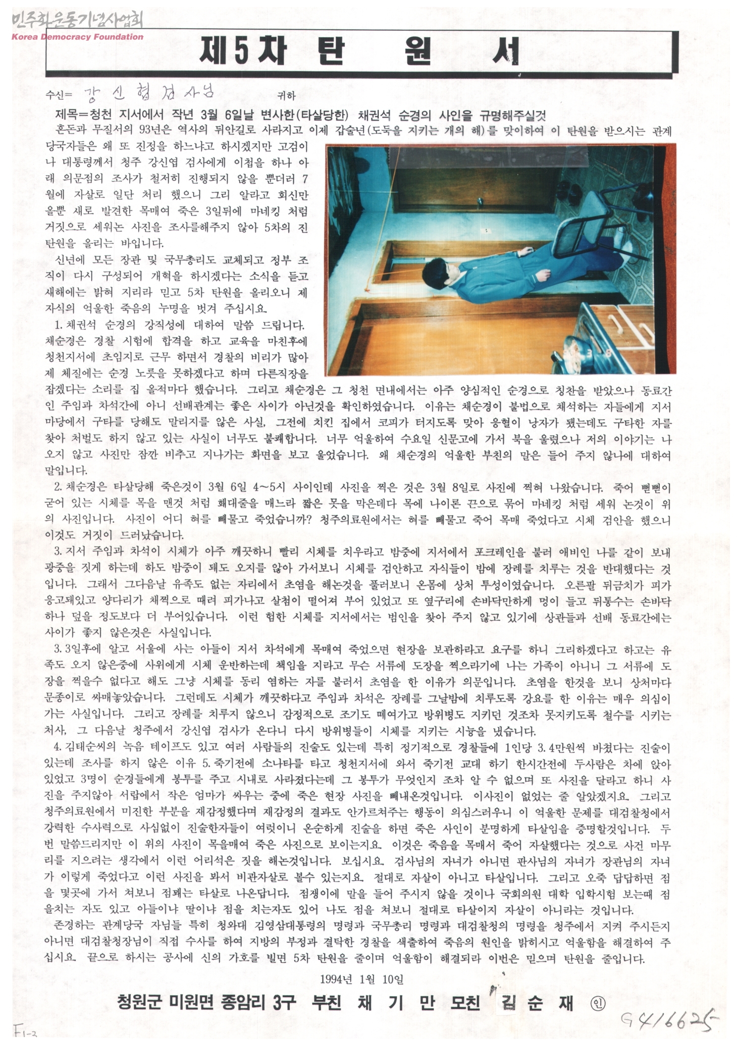 제5차 탄원서-청천 지서에서 작년 3월 6일날 변사한(타살당한) 채권석 순경의 사인을 규명해주실것[수신:강신협 검사님]