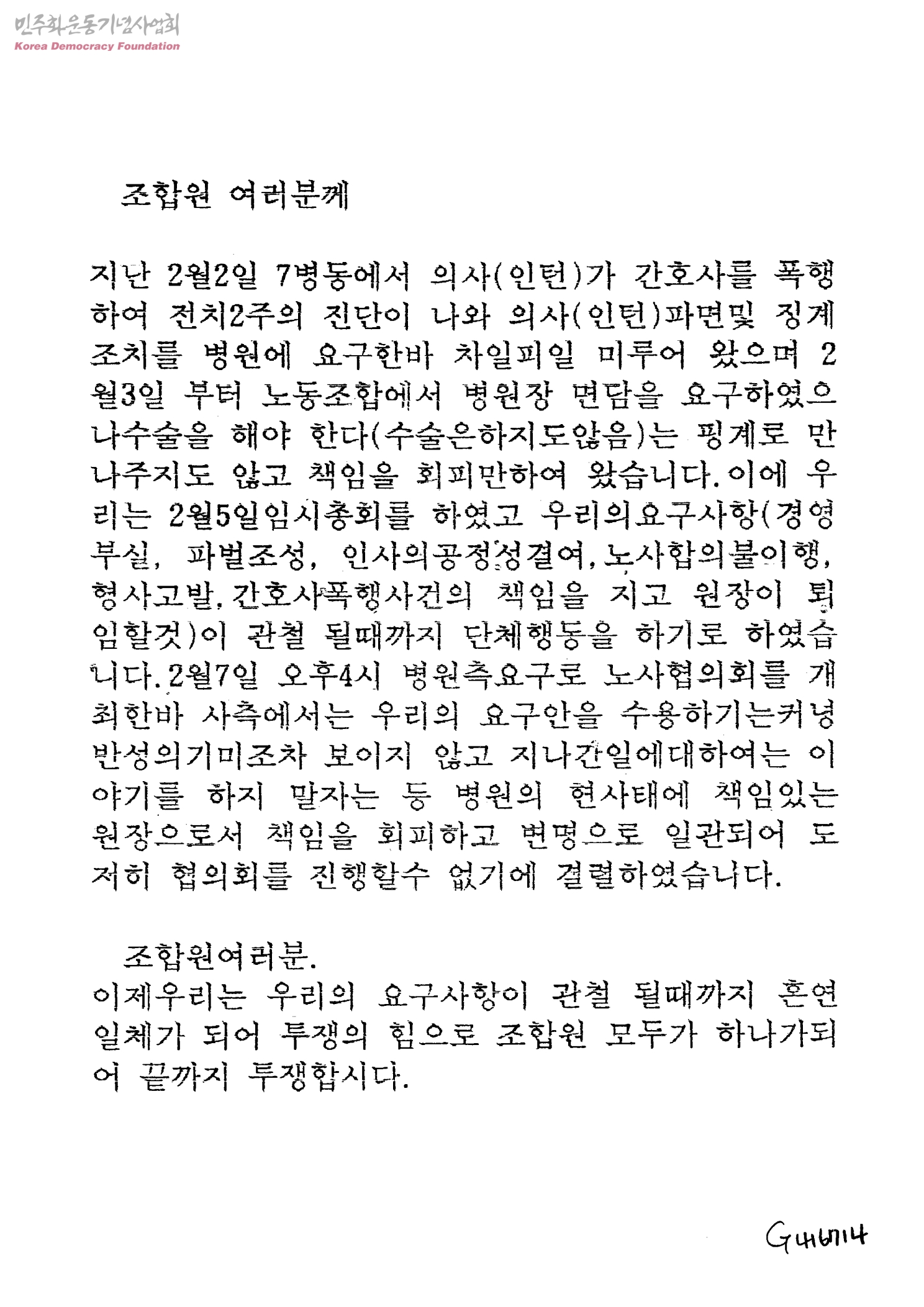 [인턴의 간호사 폭행에 관한 의료원원장 퇴임 관철요구 투쟁]