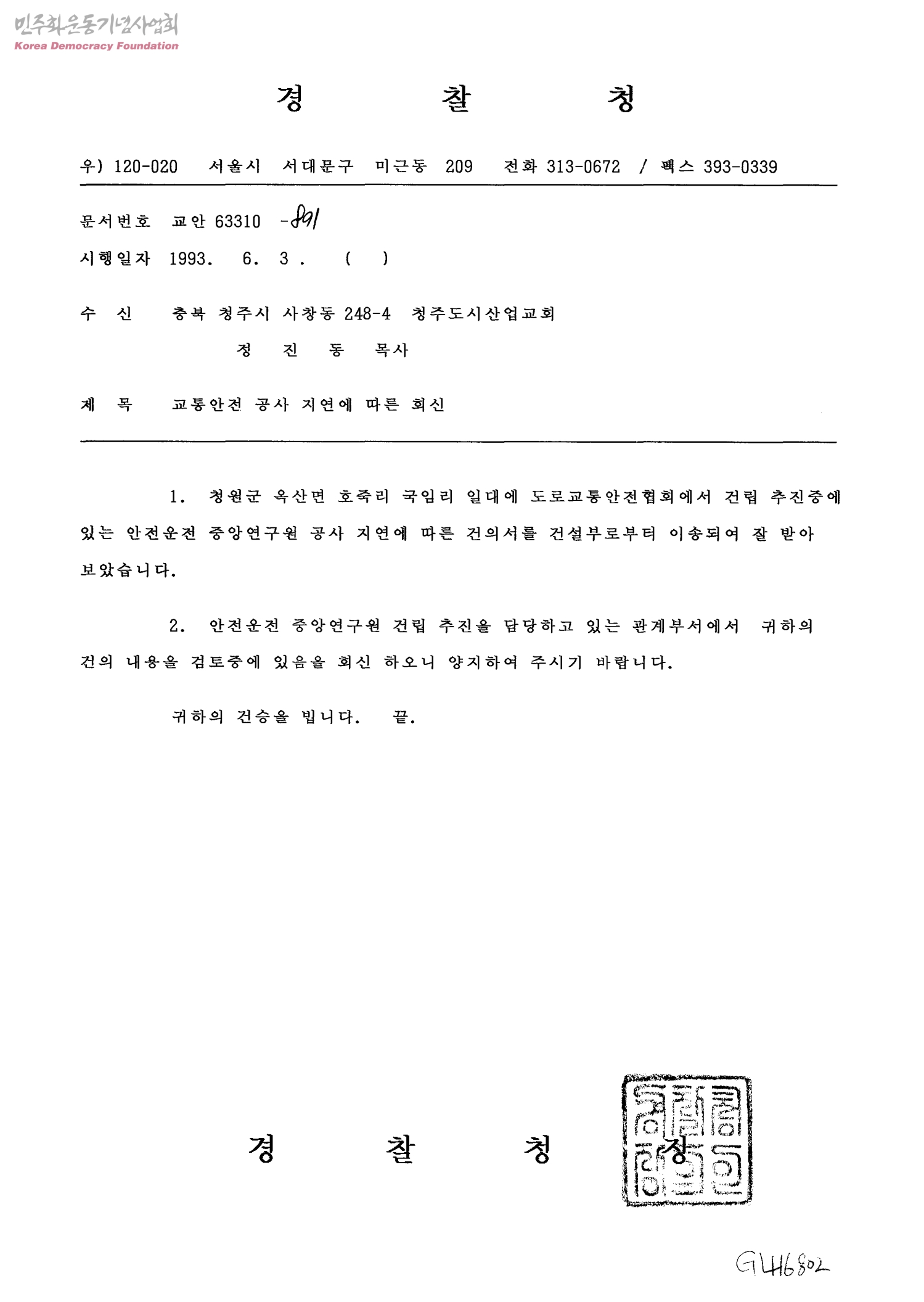 교통안전 공사 지연에 따른 회신[수신:청주도시산업교회 정진동목사]