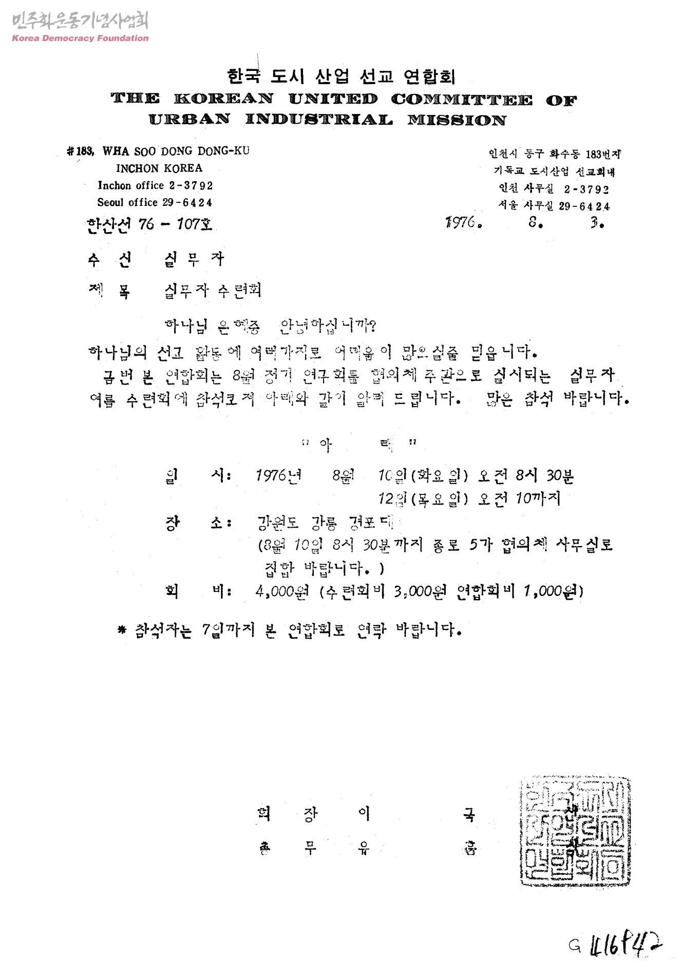 실무자 수련회[수신:실무자,발신:한국도시산업선교연합회]