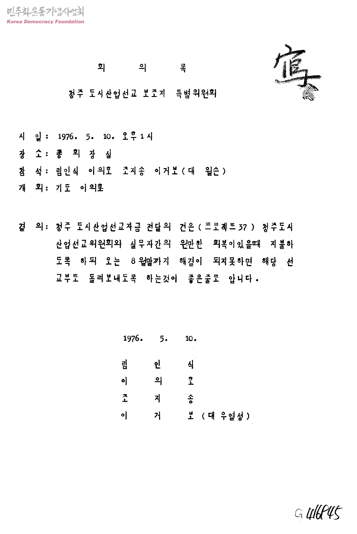 회의록[청주 도시산업선교자금 전달의 건]