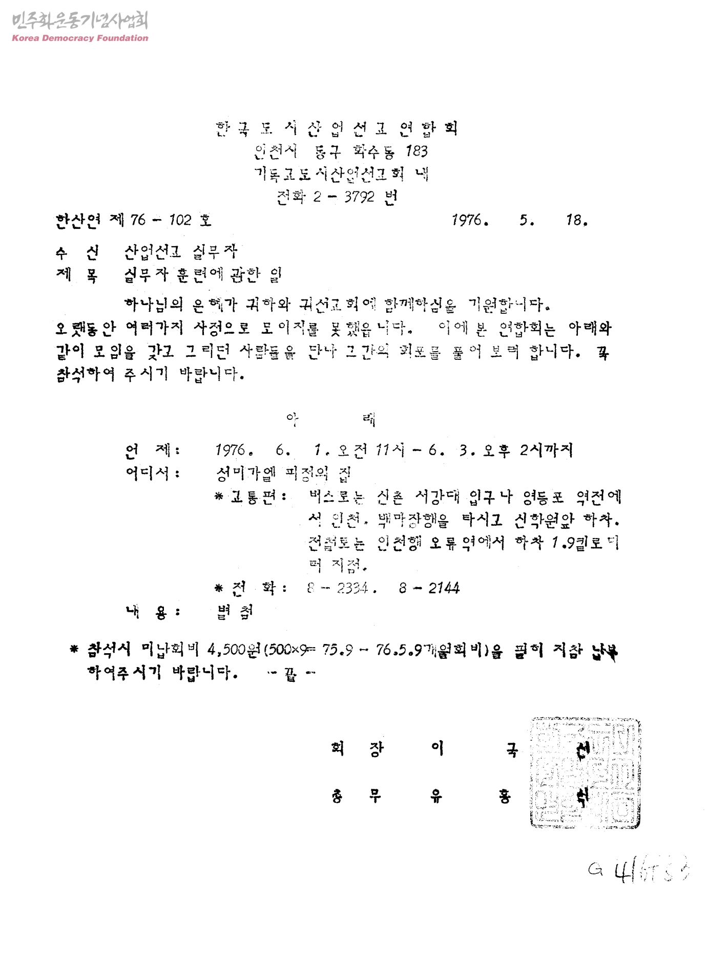 실무자 훈련에 관한 일[수신:산업선교 실무자,발신:한국도시산업선교연합회]