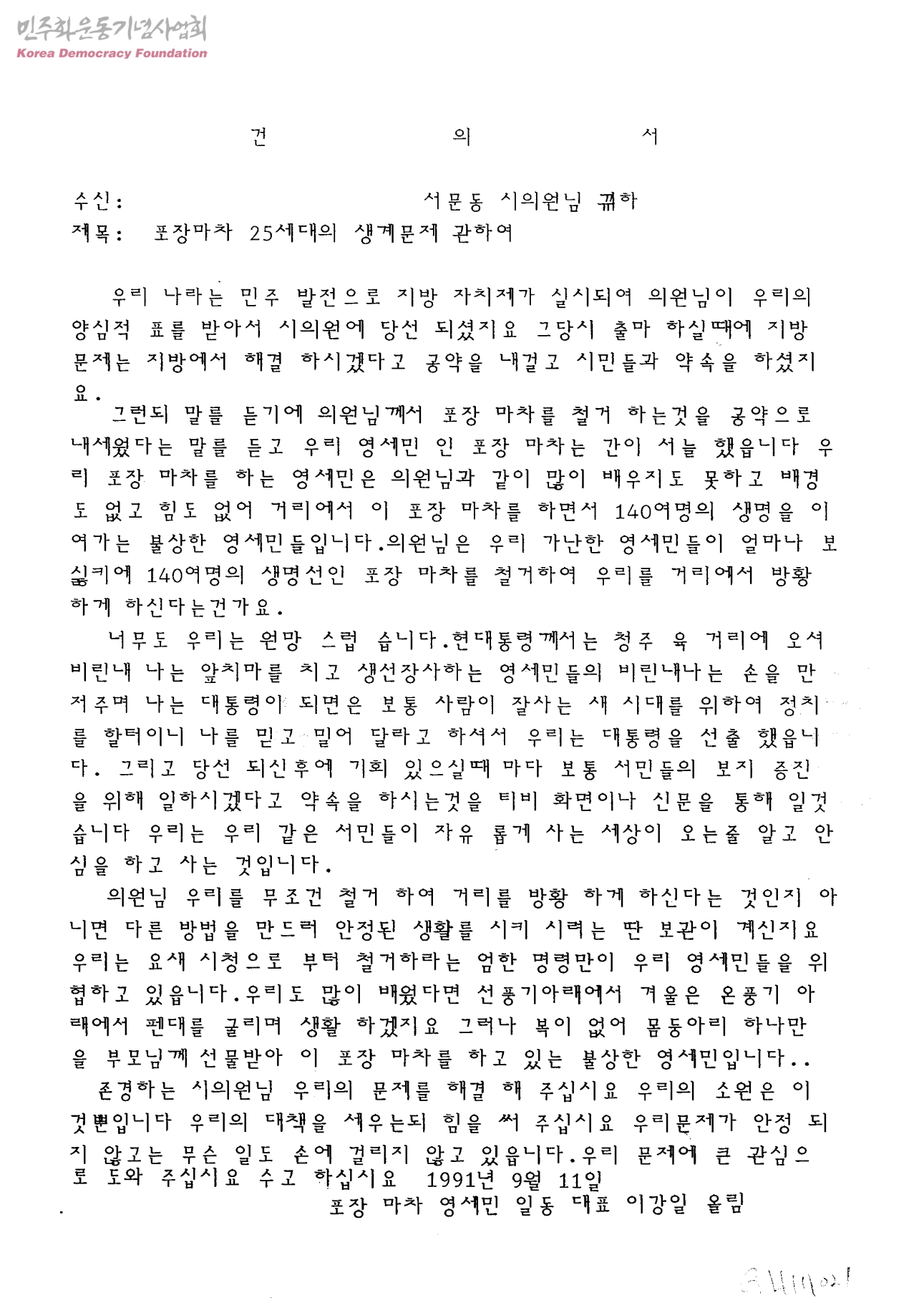 - 서문동 시위원에게 포장마차 철거의 취소에 협조해 달라는 건의서.
