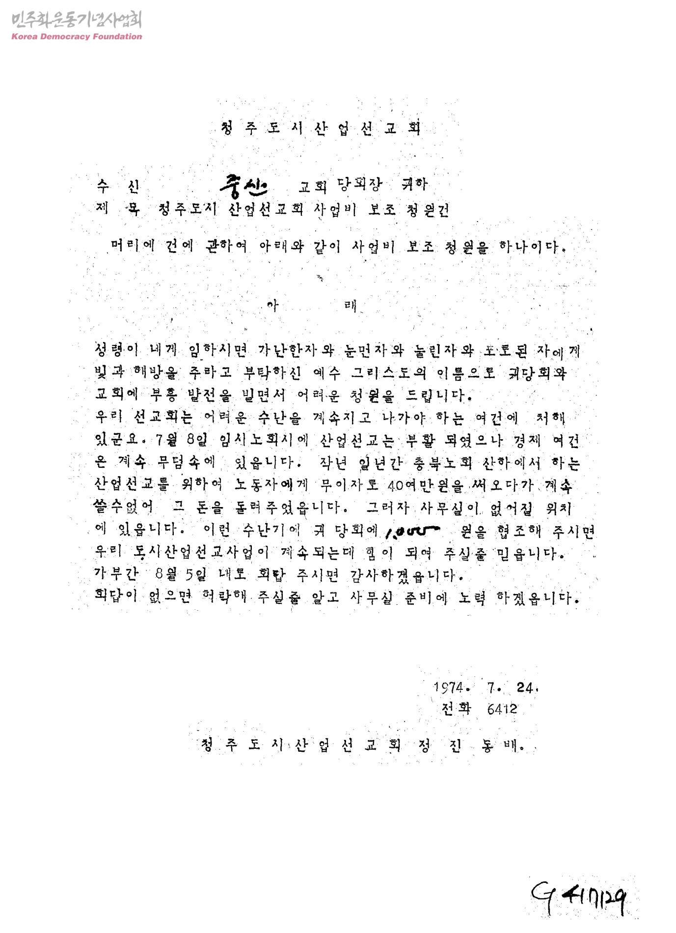 청주도시산업선교회 사업비 보조 청원건[수신:중산교회당회장,발신:청주도시산업선교회 정진동]