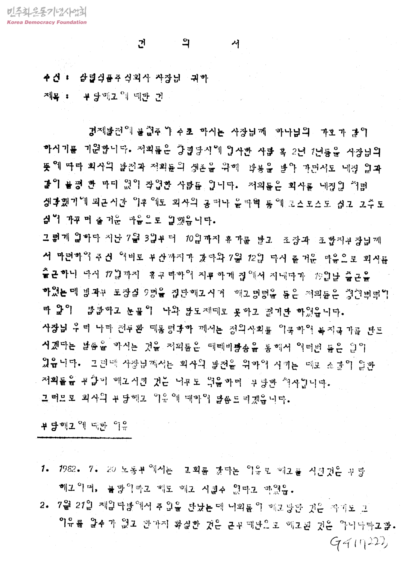 건의서-부당해고에 대한 건[수신:삼립식품주식회사 사장님,발신:해고자 일동]