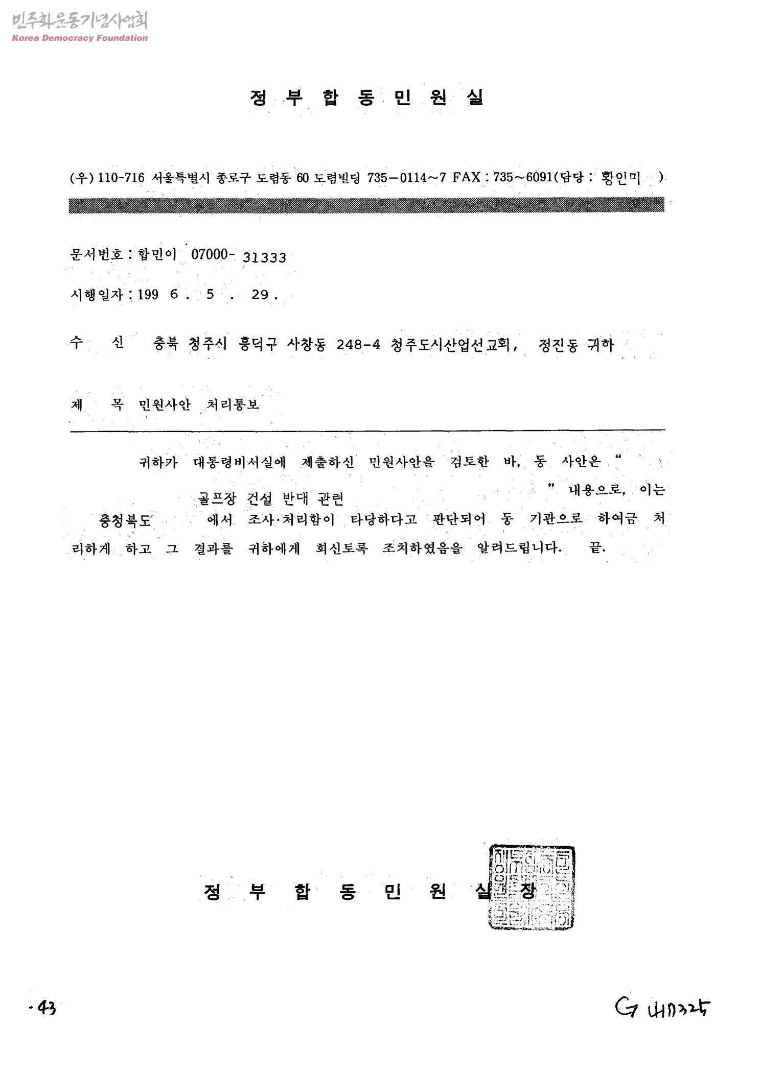 민원사안 처리통보[골프장건설 반대관련 민원 충청북도 이첩 안내][수신:청주도시산업선교회 정진동]