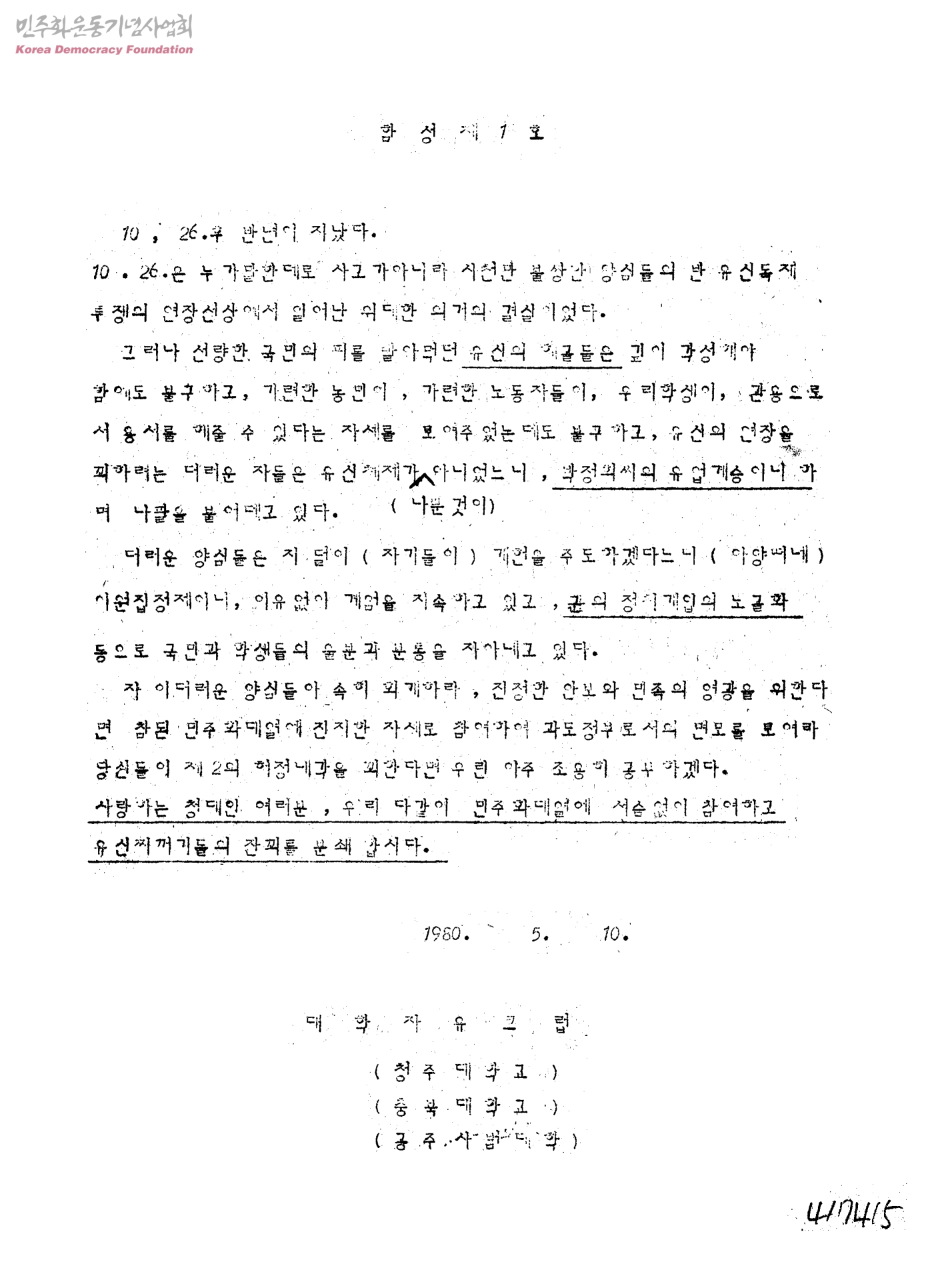 - 사랑하는 청대인 여러분, 우리 다같이ㅏ 민주화대열게 서슴없이 참여하고 유신찌꺼기들의 잔꾀를 분쇄 합시다