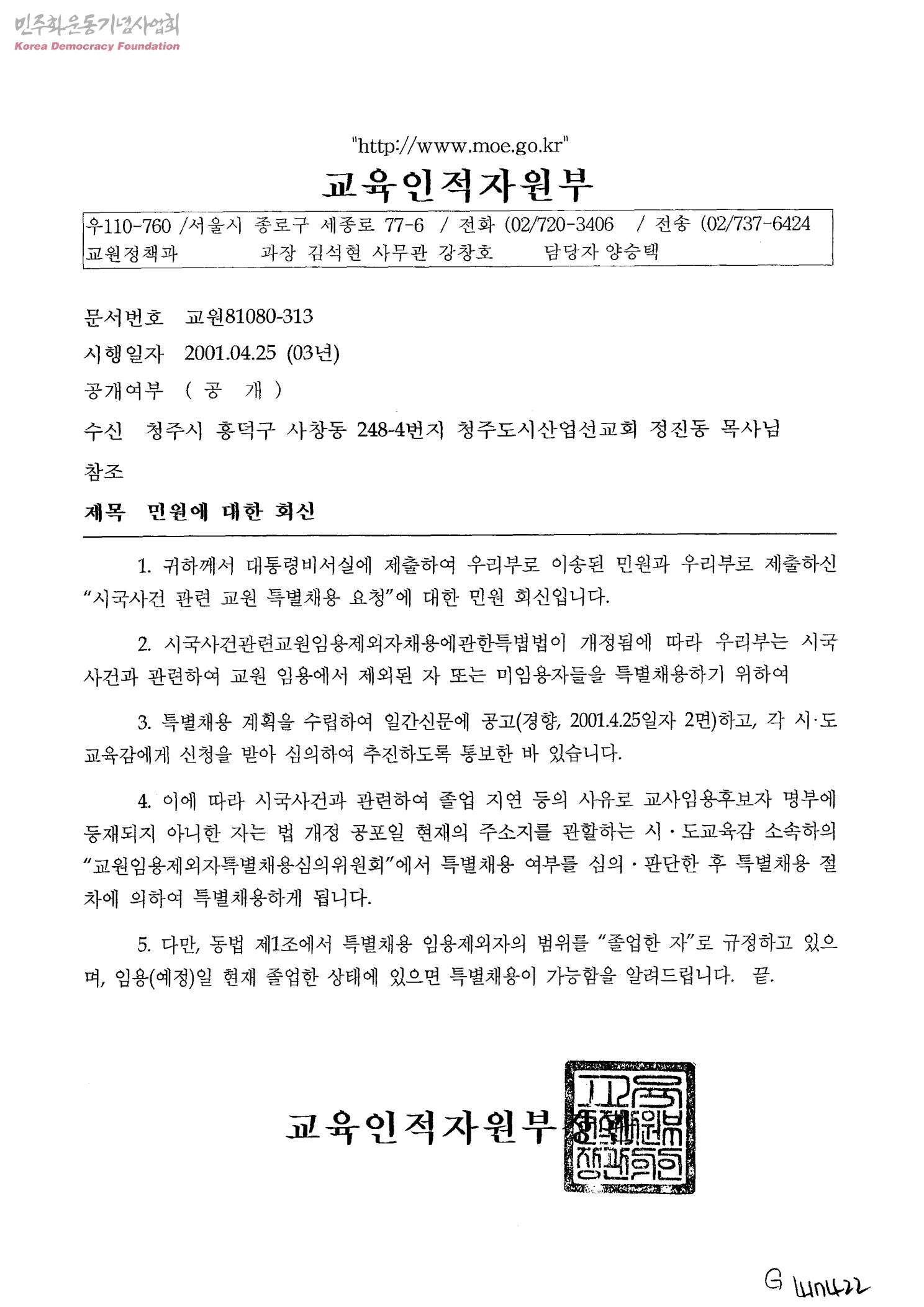 민원에 대한 회신[시국사건 관련 교원 특별채용 요청][수신:청주도시산업선교회 정진동 목사님]
