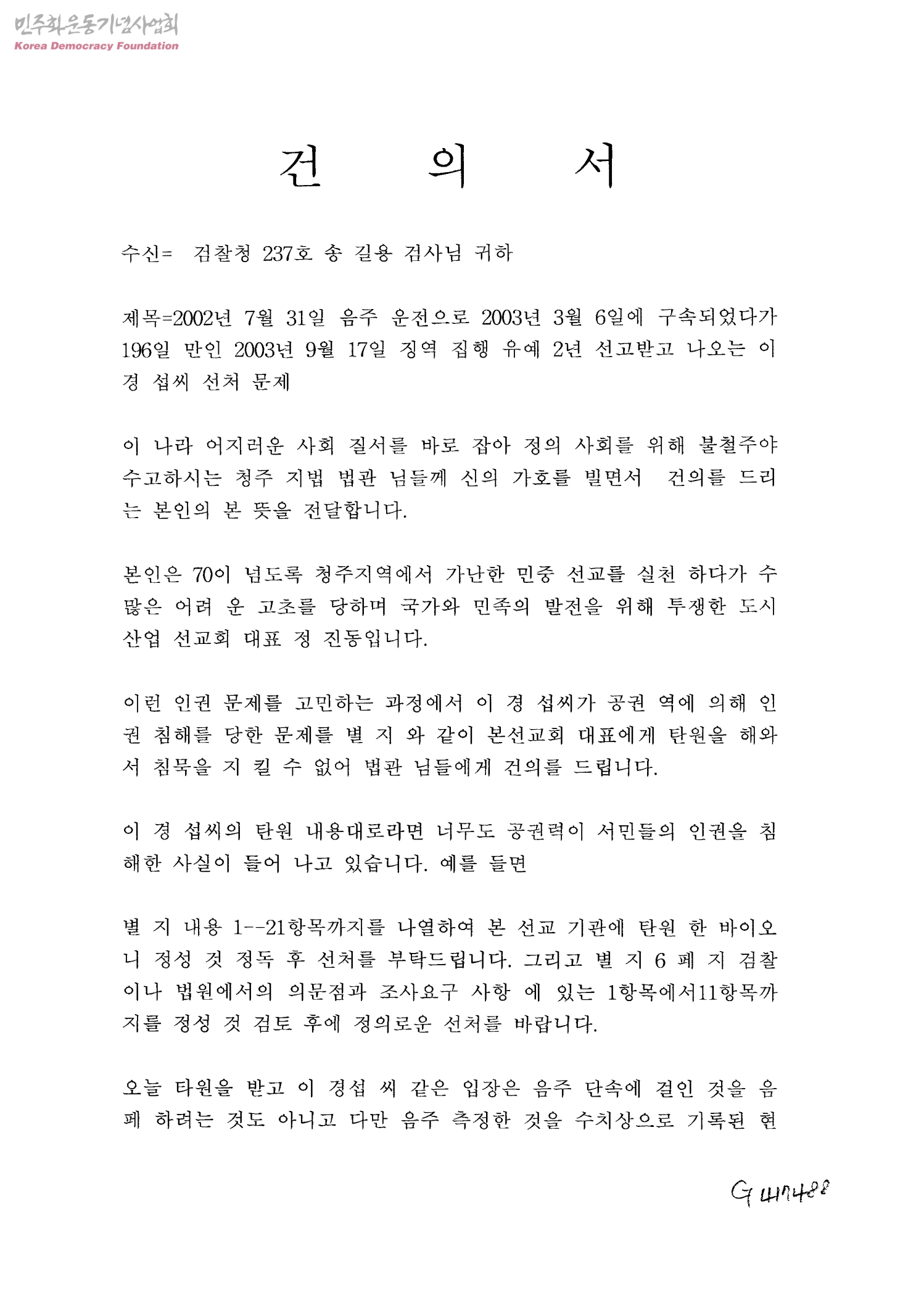 건의서-2002년 7월 31일 음주운전으로 2003년 3월 6일에 구속되었다가 196일만인 2003년 9월 17일 징역 집행 유예2년 선고받고 나오는 이경섭씨 선처 문제[수신:검찰청 237호 송길용 검사님]