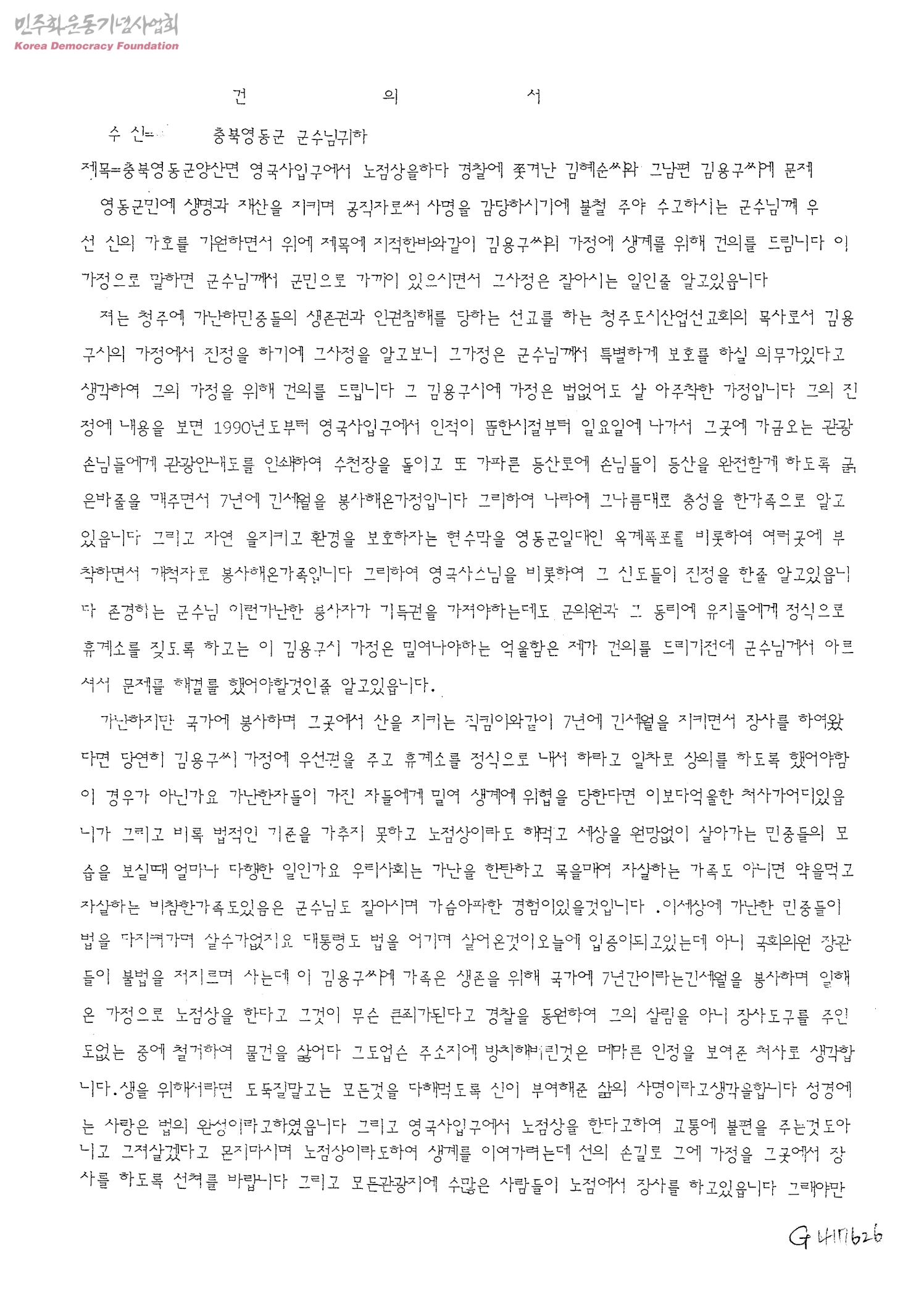 건의서-충북영동군양산면 영국사입구에서 노점상을하다 경찰에 쫓겨난 김혜순씨와 그 남편 김용구씨에 문제[수신:충북영동군 군수님]