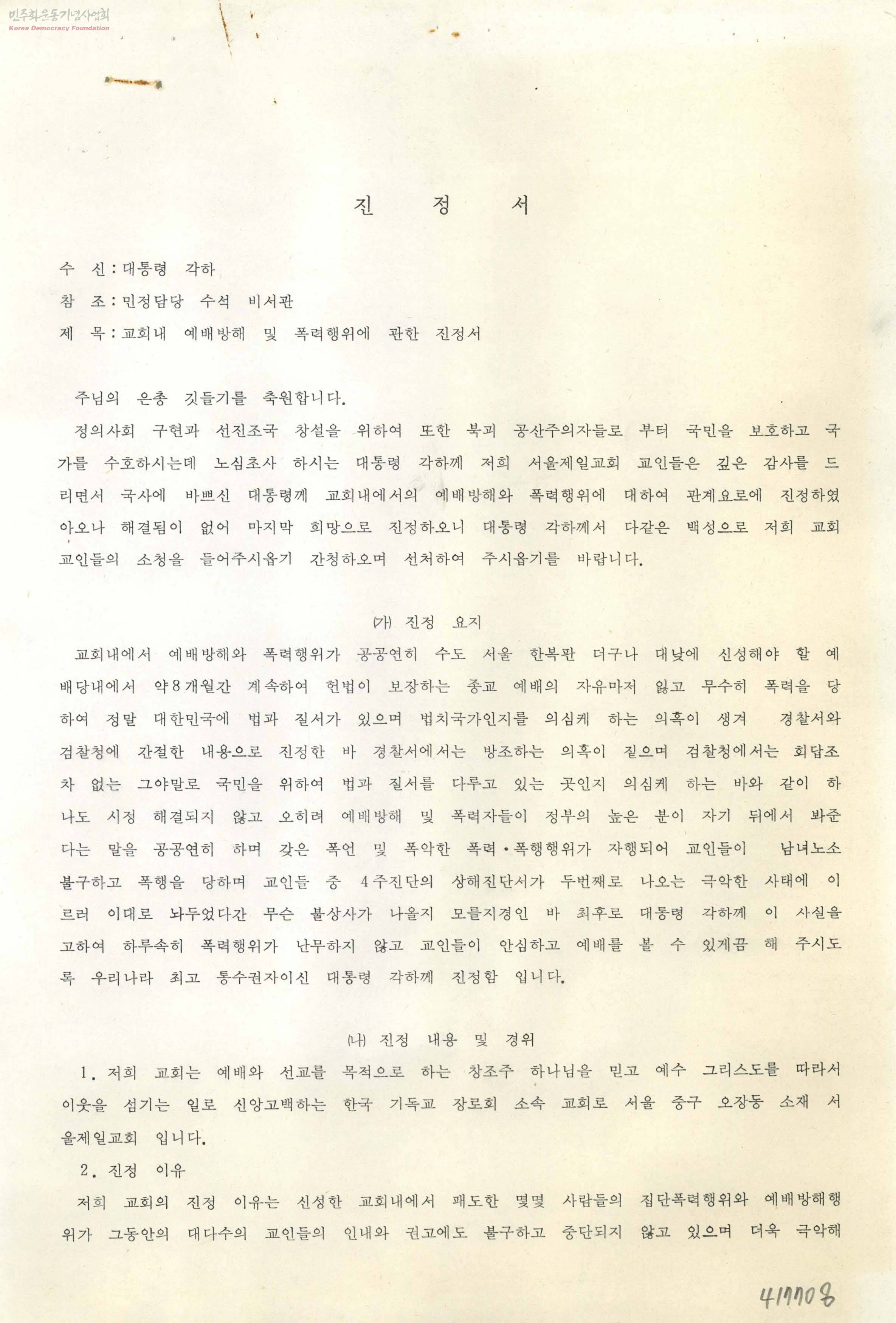 진정서-교회내 예배방해 및 폭력행위에 관한 진정서[수신:대통령,발신:서울제일교회]