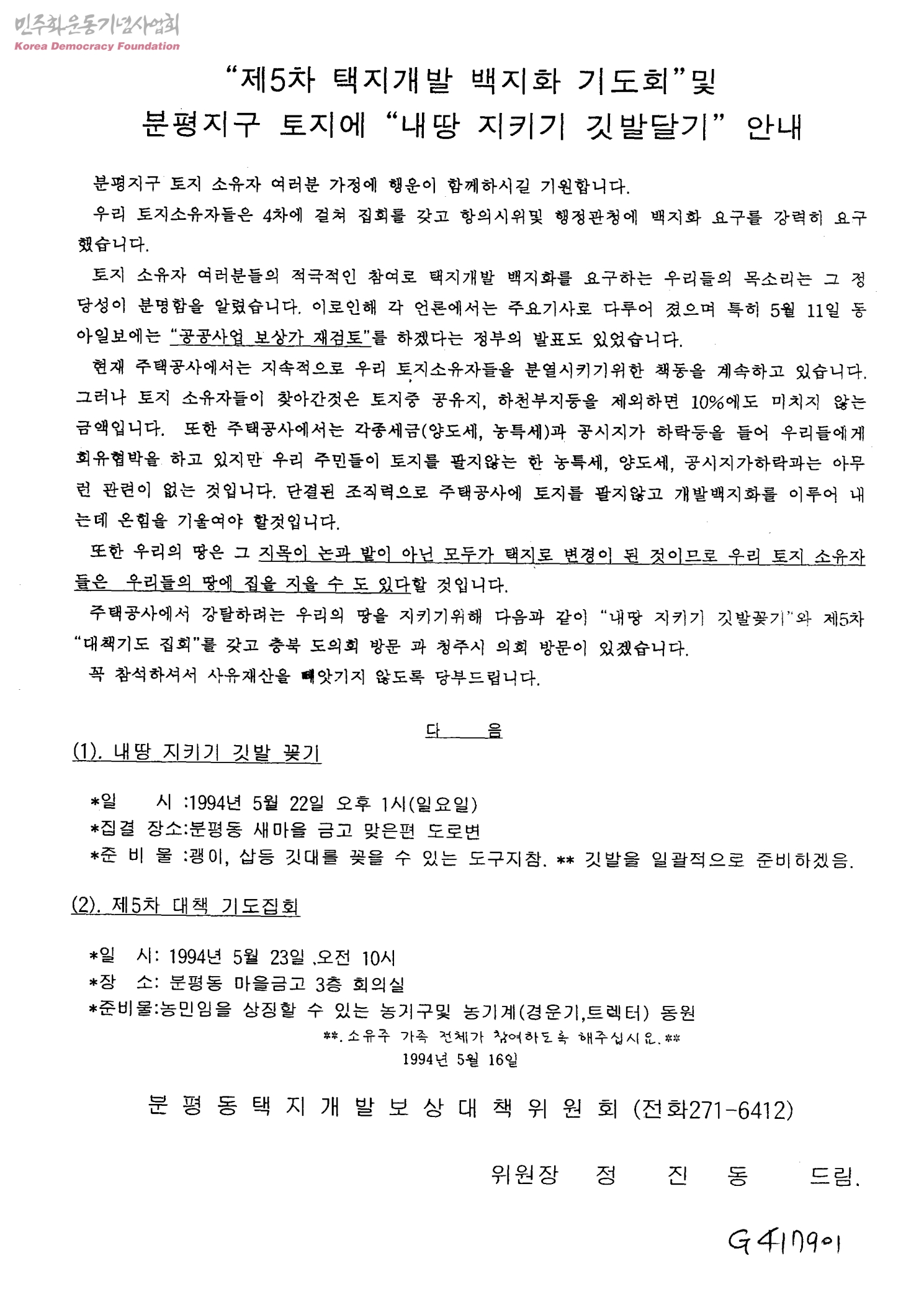 [주택공사 관련서류]"제5차 택지개발 백지화 기도회" 및 분평지구 토지에 "내땅 지키기 깃발달기" 안내