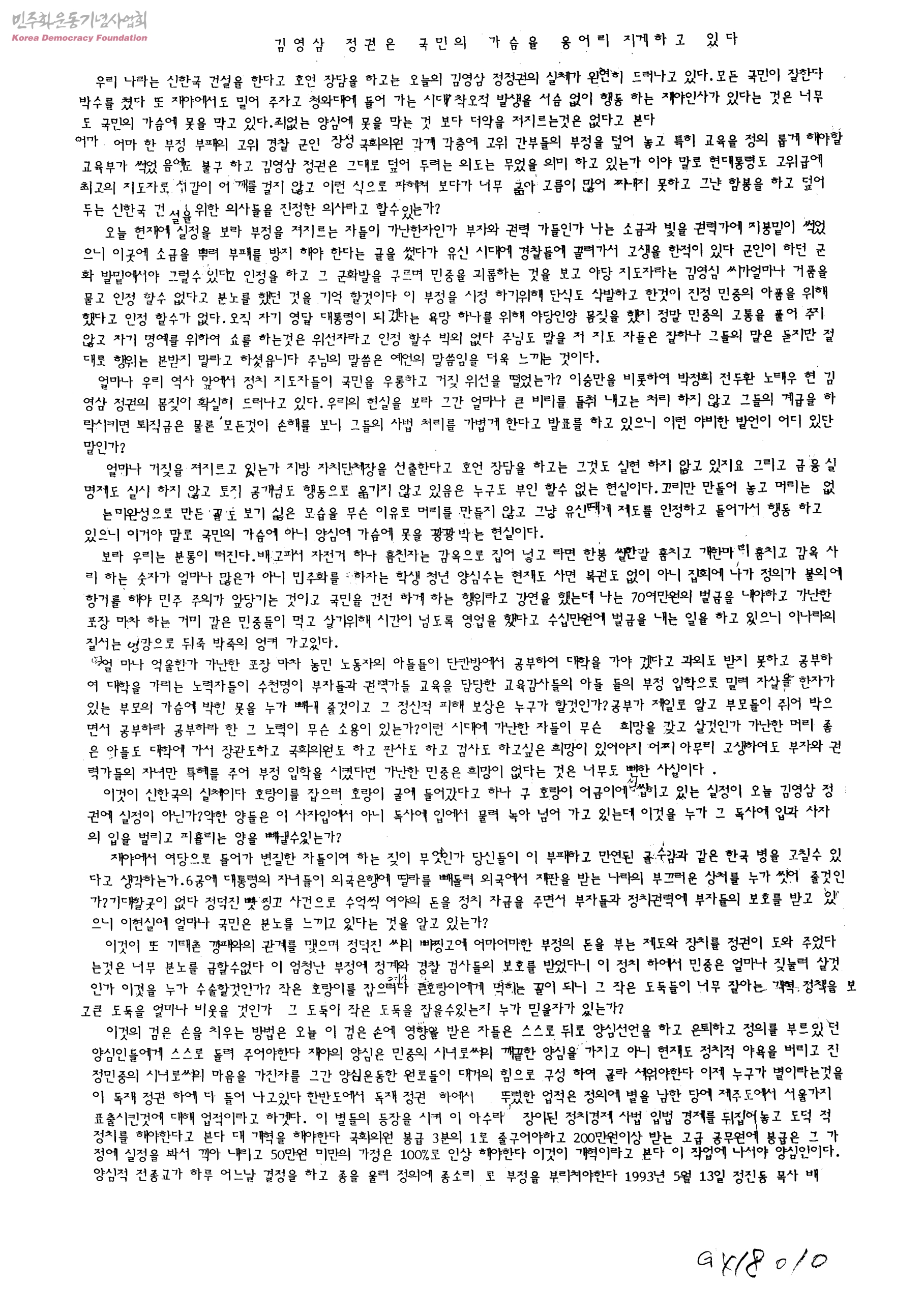 김영삼 정권은 국민의 가슴을 응어리 지게하고 있다