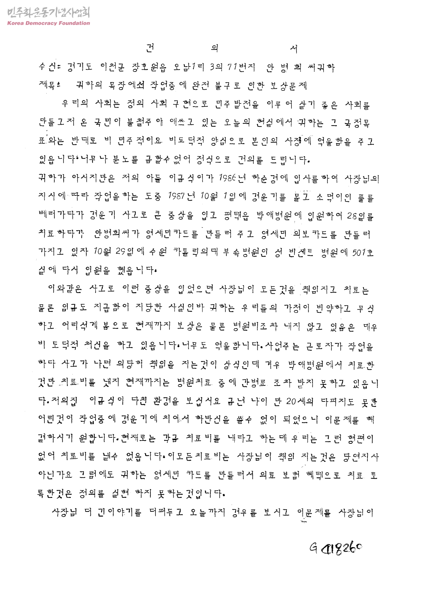 건의서-귀하의 목장에서 작업중에 완전 불구로 인한 보상문제[수신:안병희]