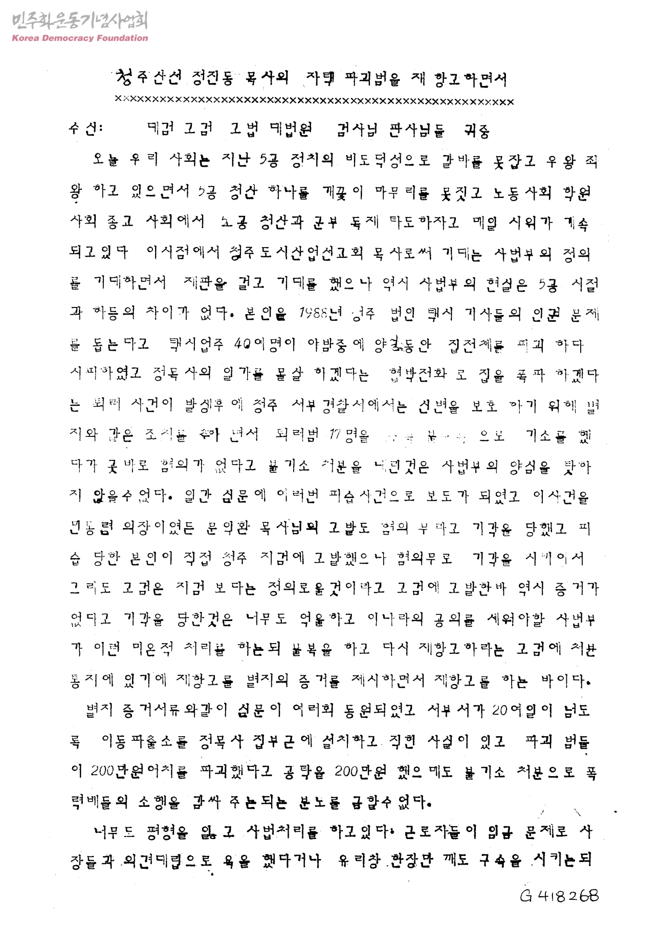 청주산선 정진동 목사의 자택파괴범을 재 항고하면서[수신:대검 고검 고법 대법원 검사님 판사님들]