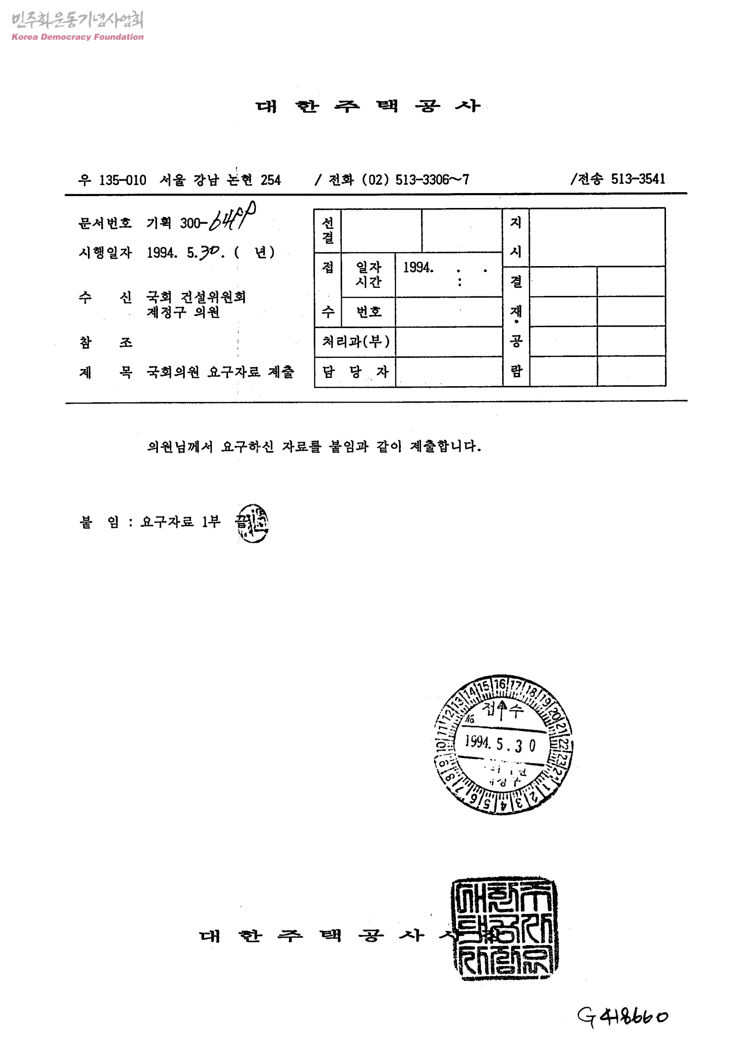 [보충자료-고충처리위발송관련]국회의원 요구자료 제출[수신:국회 건설위원회 제정구 의원, 발신:대한주택공사]