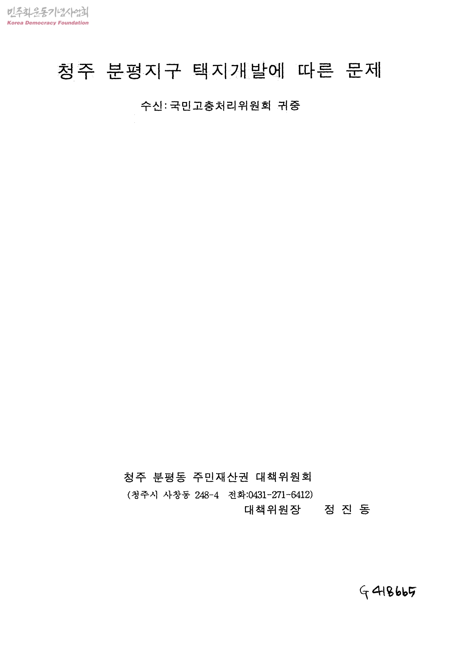 청주 분평지구 택지개발에 따른 문제[수신:국민고충처리위원회, 발송:청주분평동주민재산권대책위원회]