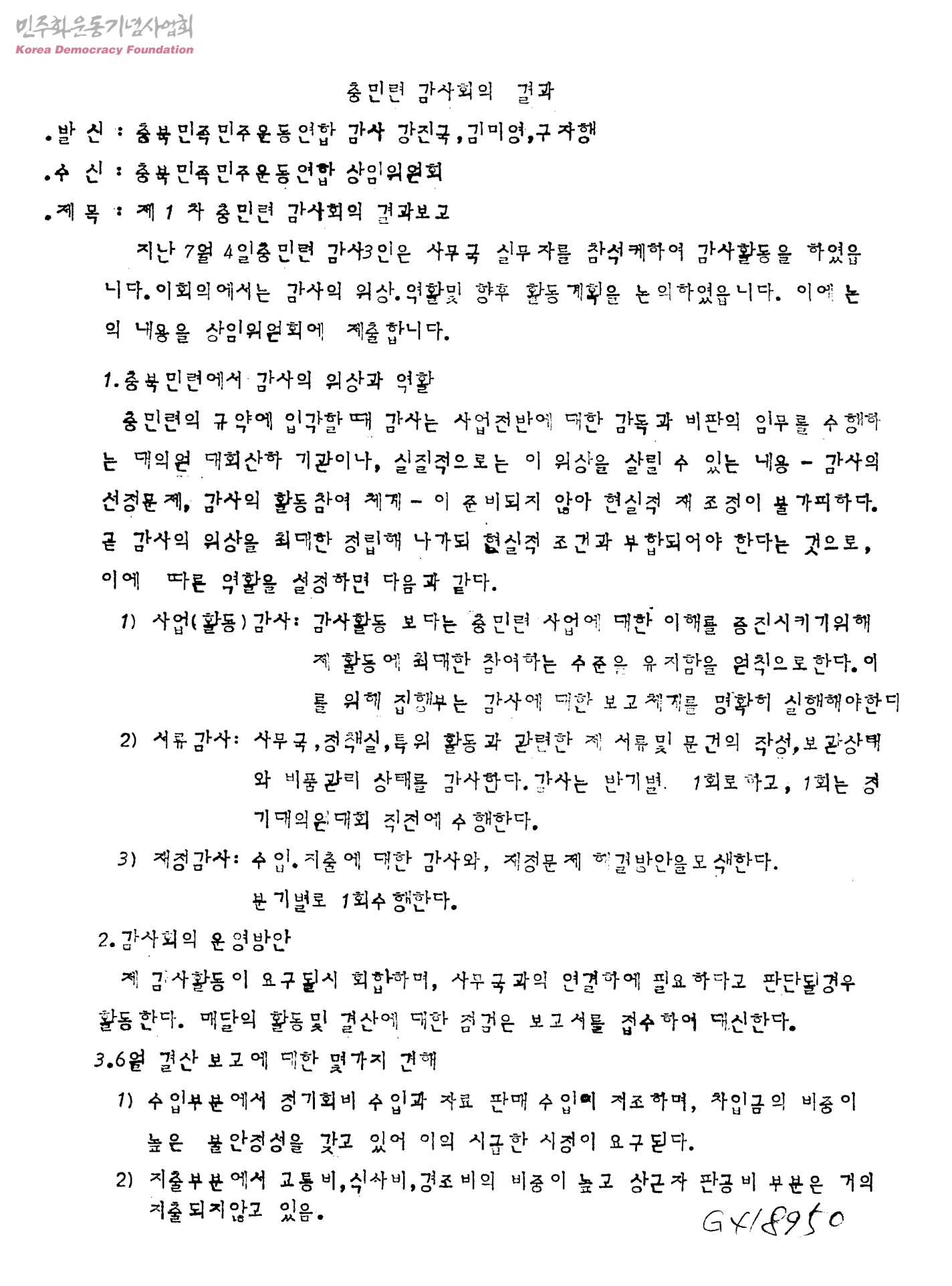 제1차 충민련 감사회의 결과보고[수신:충북민족민주운동연합 상임위원회,발신:충북민족민주운동연합 감사 강진국,김미영,구자행]