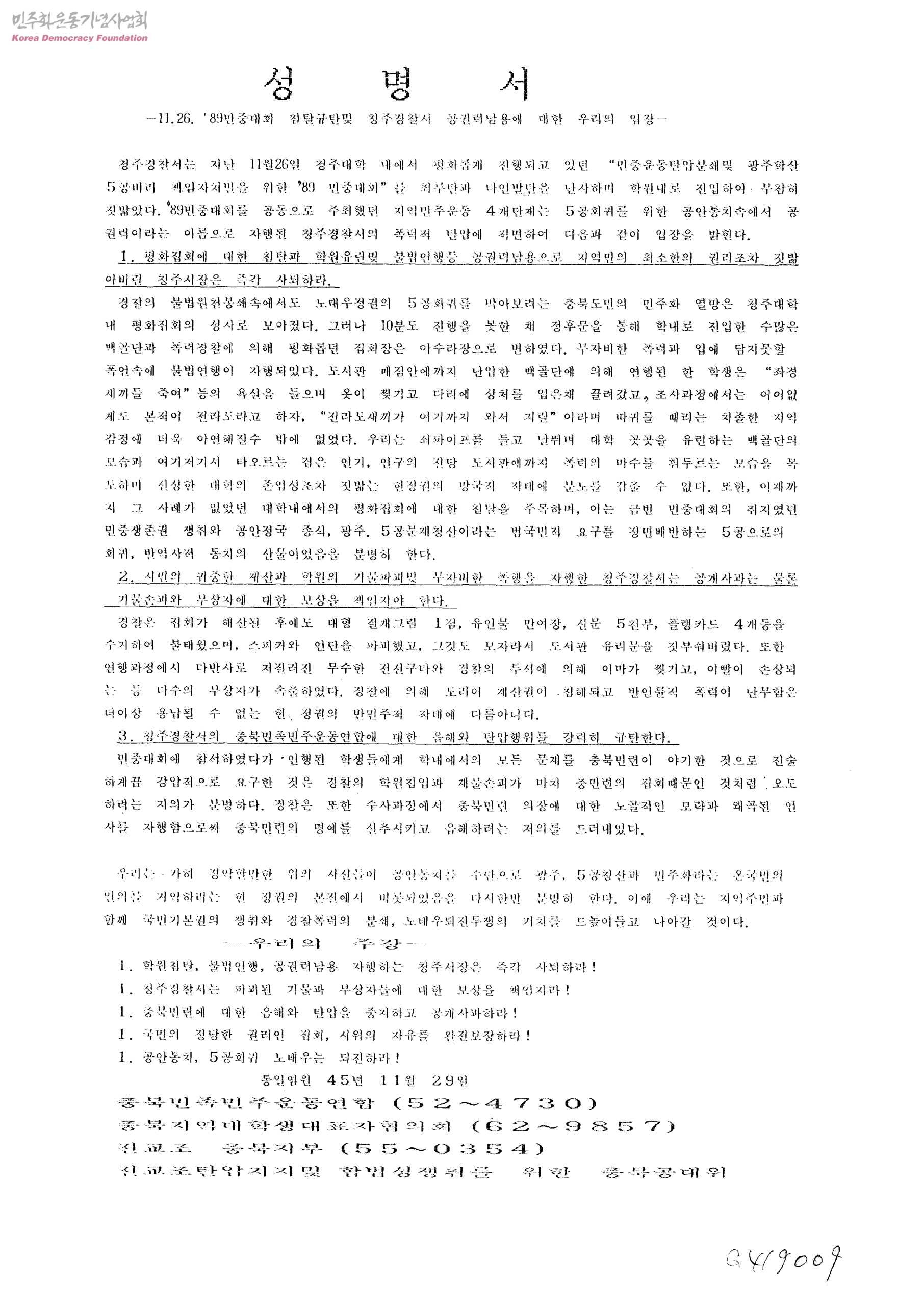 성명서-11.26.'89민중대회 침탈규탄 및 청주경찰서 공권력남용에 대한 우리의 입장
