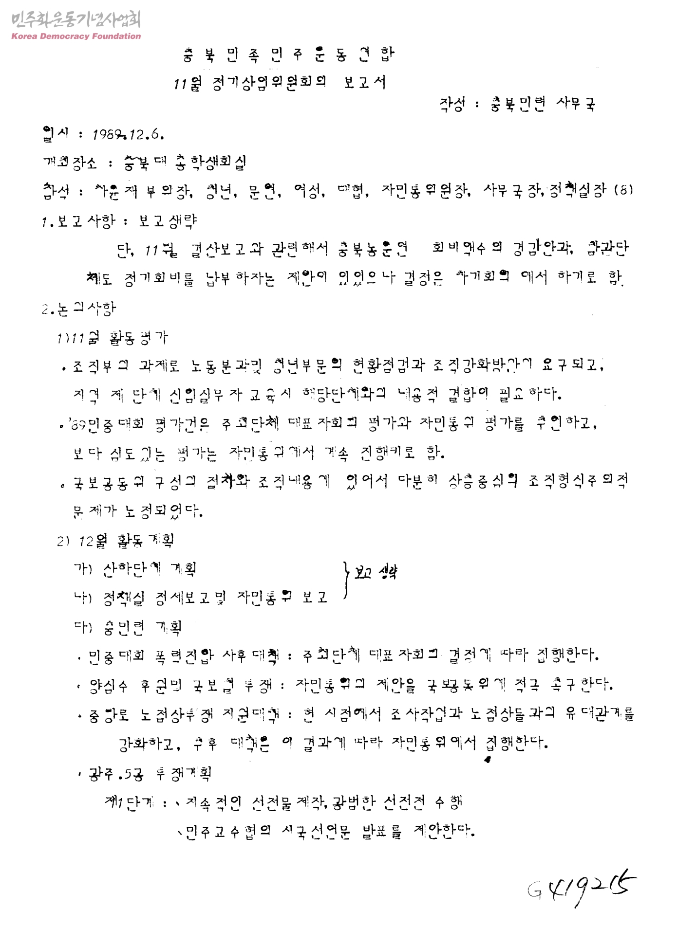 충북민족민주운동연합 11월 정기상임위원회의 보고서