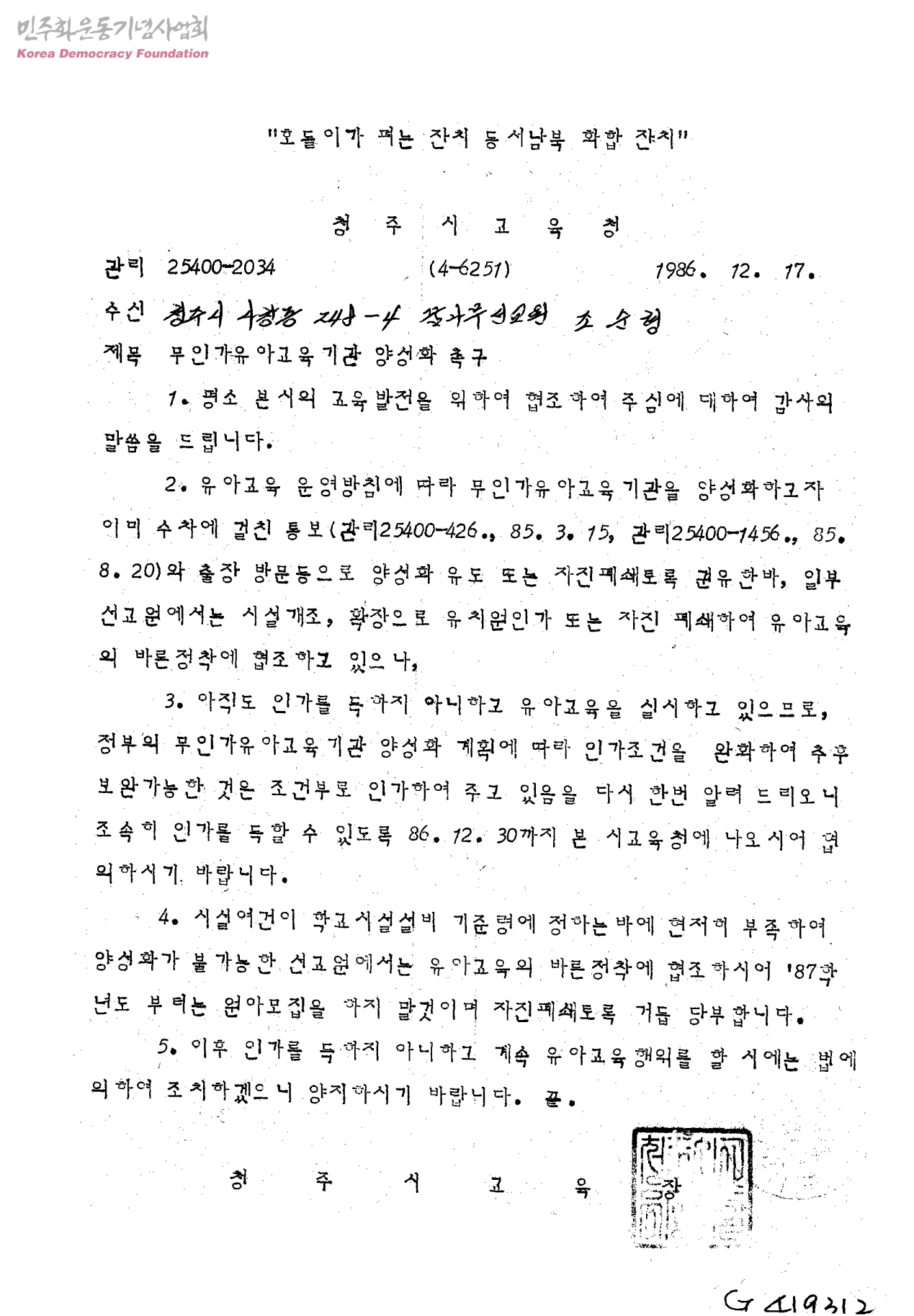 무인가 유아교육기관 양성화 촉구[수신:꿈나무선교원 조순형]
