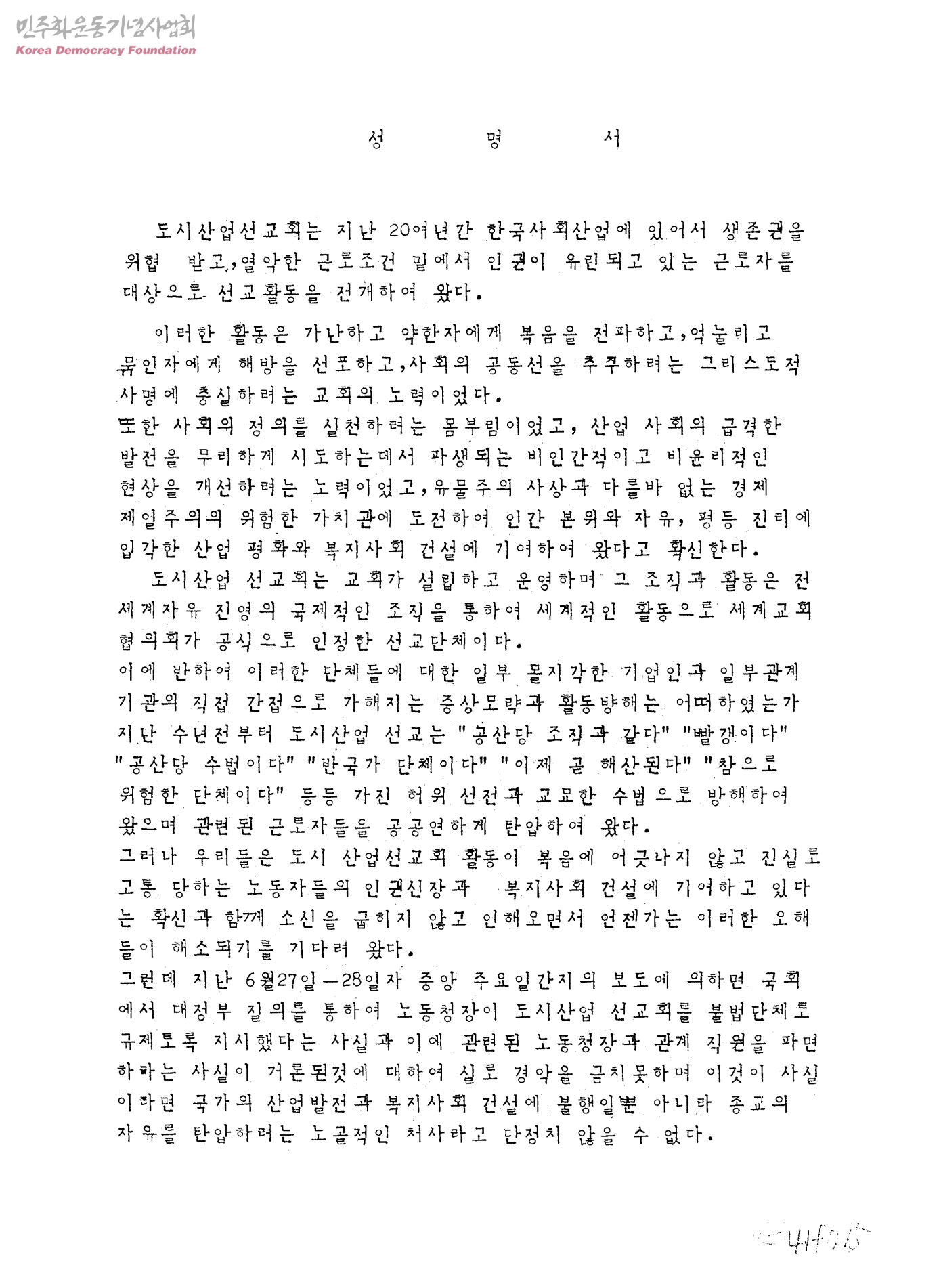 - 예수교장로회영등포도시산업선교위원회,예수교장로회청주도시산업선교위원회,예수교장로교동서울도시산업선교위원회,기독교감리회인천도시산업선교회,기독교감리회영등포도시산업선교회,기독교감리회경수도시산업선교회,기독교감리회동서울도시산업선교회,기독교감리회서울도시산업선교위원회,기독교장로교도시산업선교위원회,기독교장로교동서울산업선교위원회,기독교장로교광주도시산업선교위원회