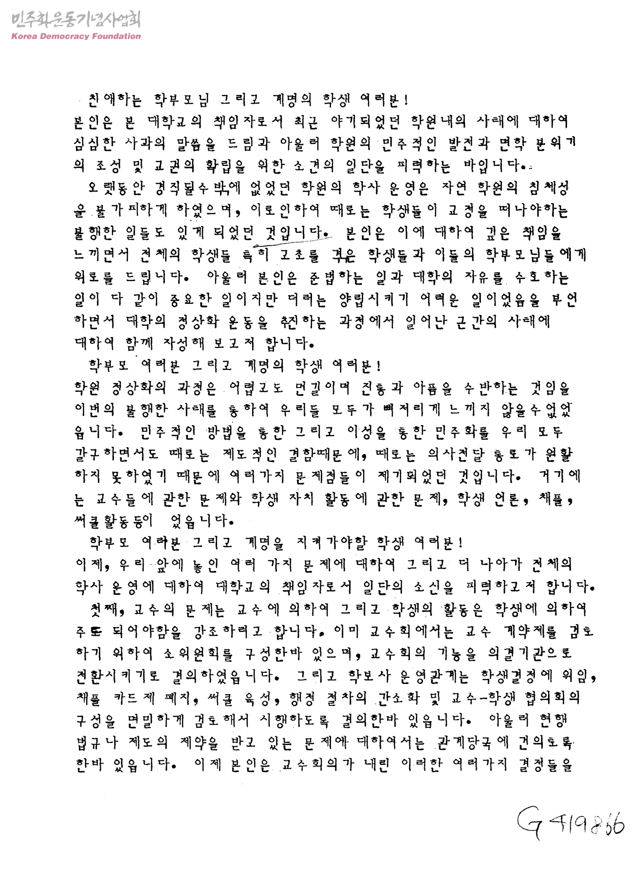 - 학원의 민주적인 발전과 면학분위기의 조성 및 교권의 확립을 위한 소견