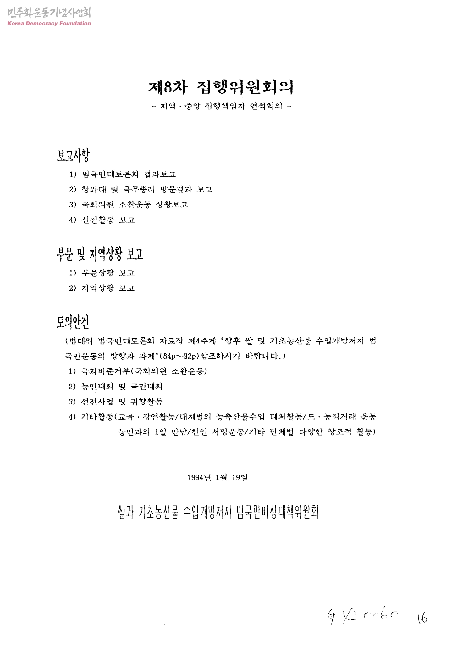 - <보고사항> 1)범국민대토론회 결과보고 2)청와대 및 국무총리 방문결과 보고 3)국회의원 소환운동 상황보고 4)선전활동 보고 <토의안건> 1)국회비준거부 2)농민대회 및 국민대회 3)선전사업 및 귀향활동 4)기타활동 첨부:쌀과 기초농산물 수입개방저지를 위한 국회비준 거부 및 국민투표실시 촉구 범국민서면운동지