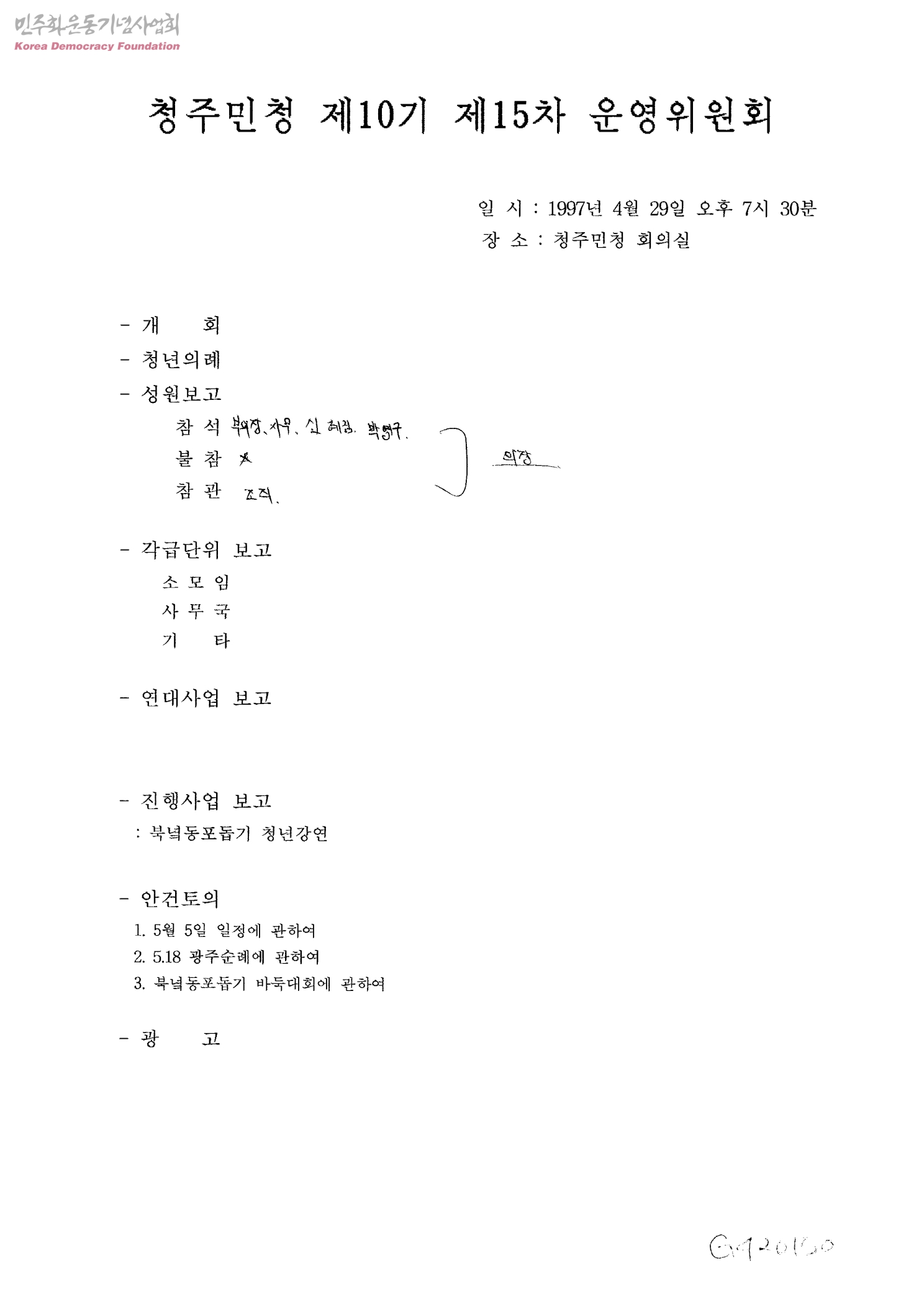 - 각급 단위보고 연대 사업보고 진행 사업보고 안건토의 1.5월5일 일정에 관하여 2.5.18 광주순례 진행에 관하여 3.북녘동포돕기 바둑대회 보고서 회의록