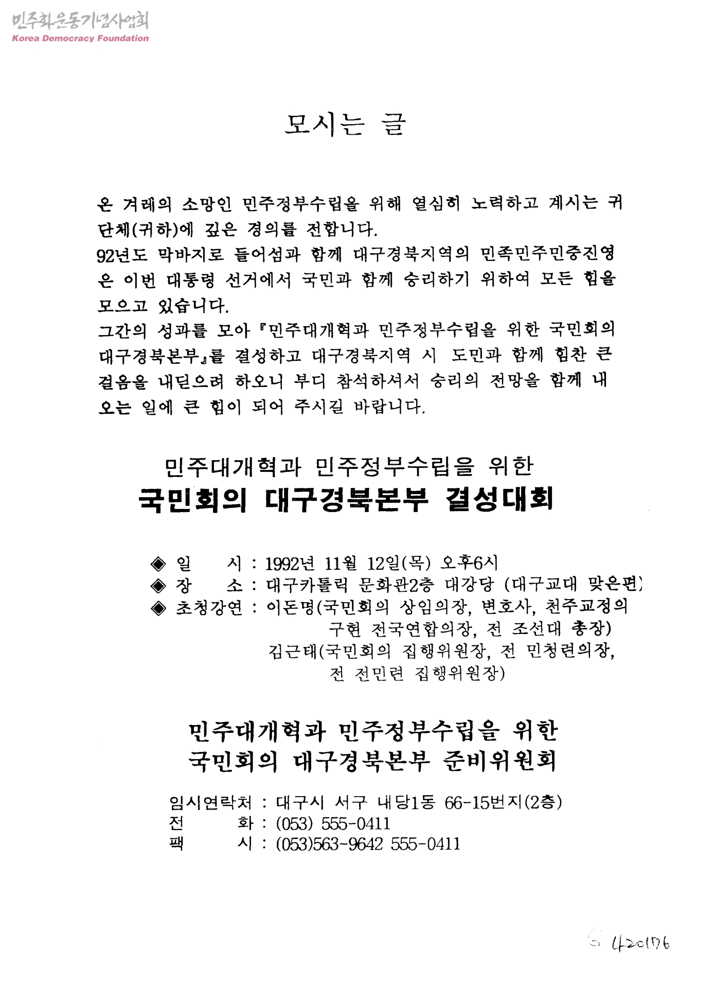 모시는 글-민주대개혁과 민주정부수립을 위한 국민회의 대구경북본부 결성대회
