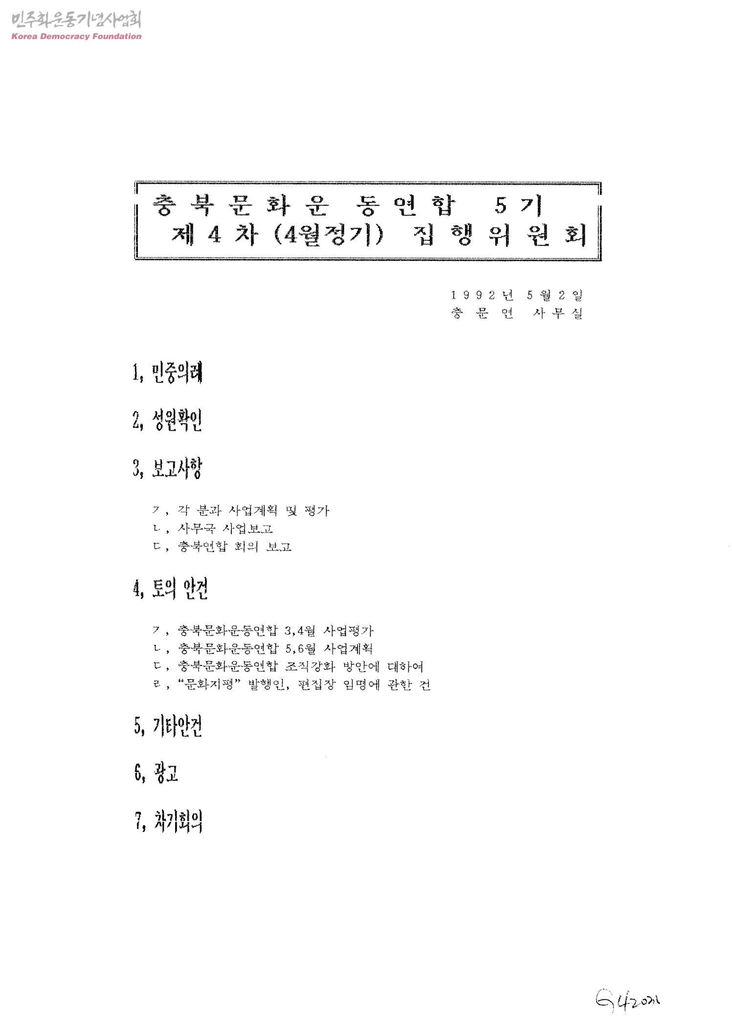 - 토의안건 ㄱ. 충북문화운동연합 3,4월 사업평가 ㄴ. 충북문화운동연합 5,6월 사업계획 ㄷ. 충북문화운동연합 조직강화 방안에 대하여 ㄹ. "문화지평" 발행인, 편집장 임명에 관한 건
