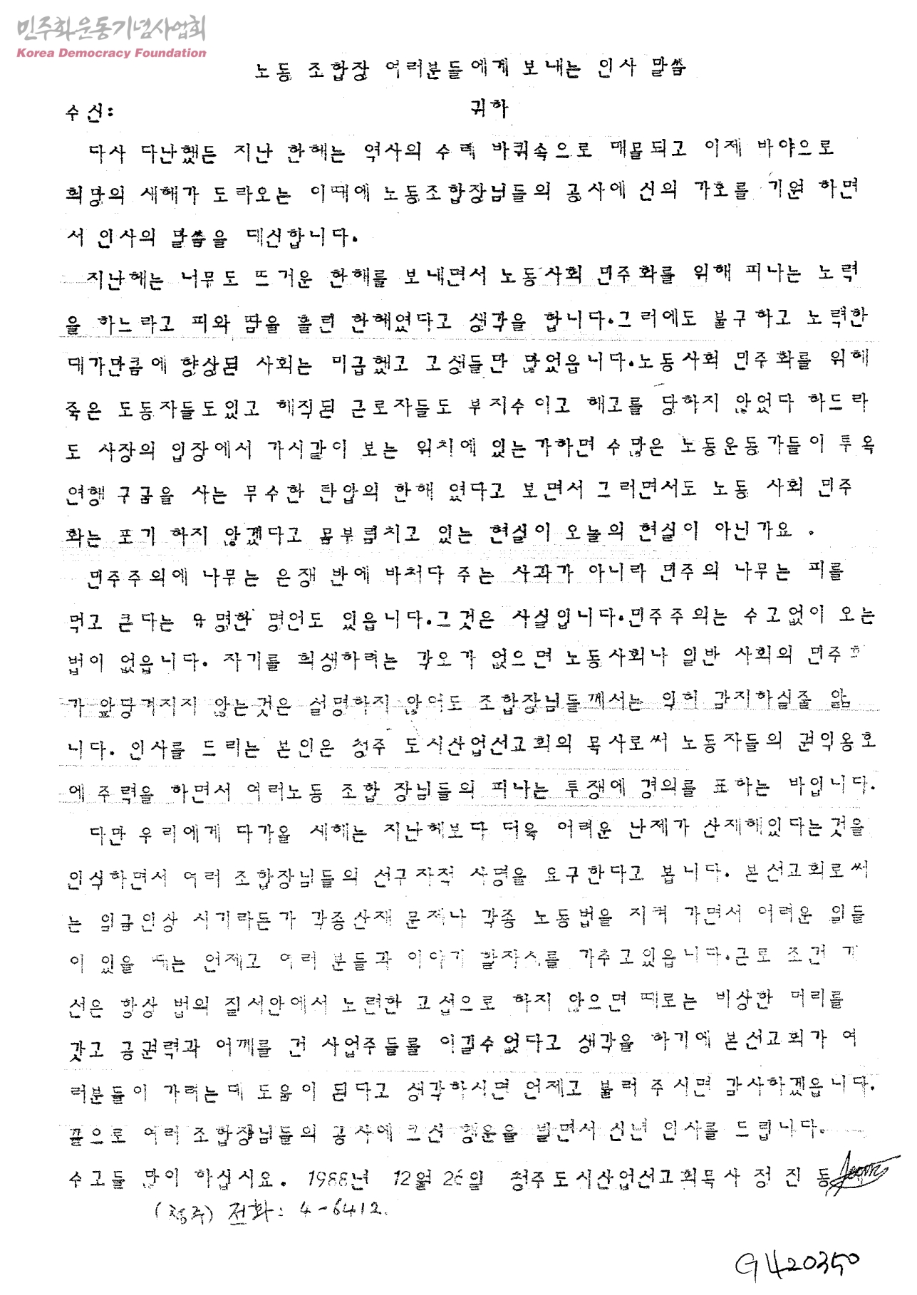 노동 조합장 여러분들에게 보내는 인사 말씀