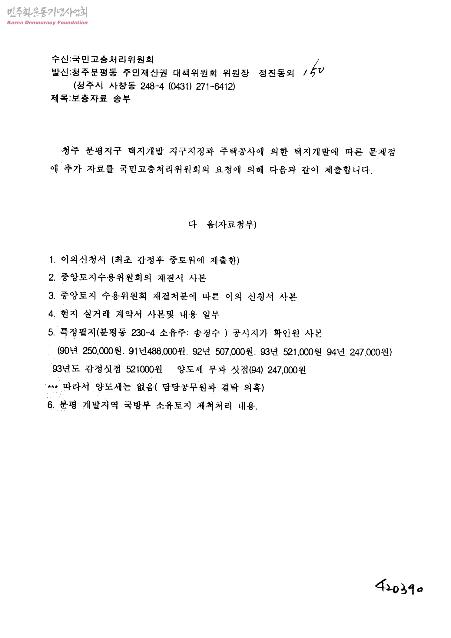 [보충자료-고충처리위발송관련]보충자료 송부[분평개발지역 국방부 소유토지 제척처리 내용][수신:국민고충처리위원회, 발신:청주분평동 주민재산권 대책위원회 위원장 정진동외150]