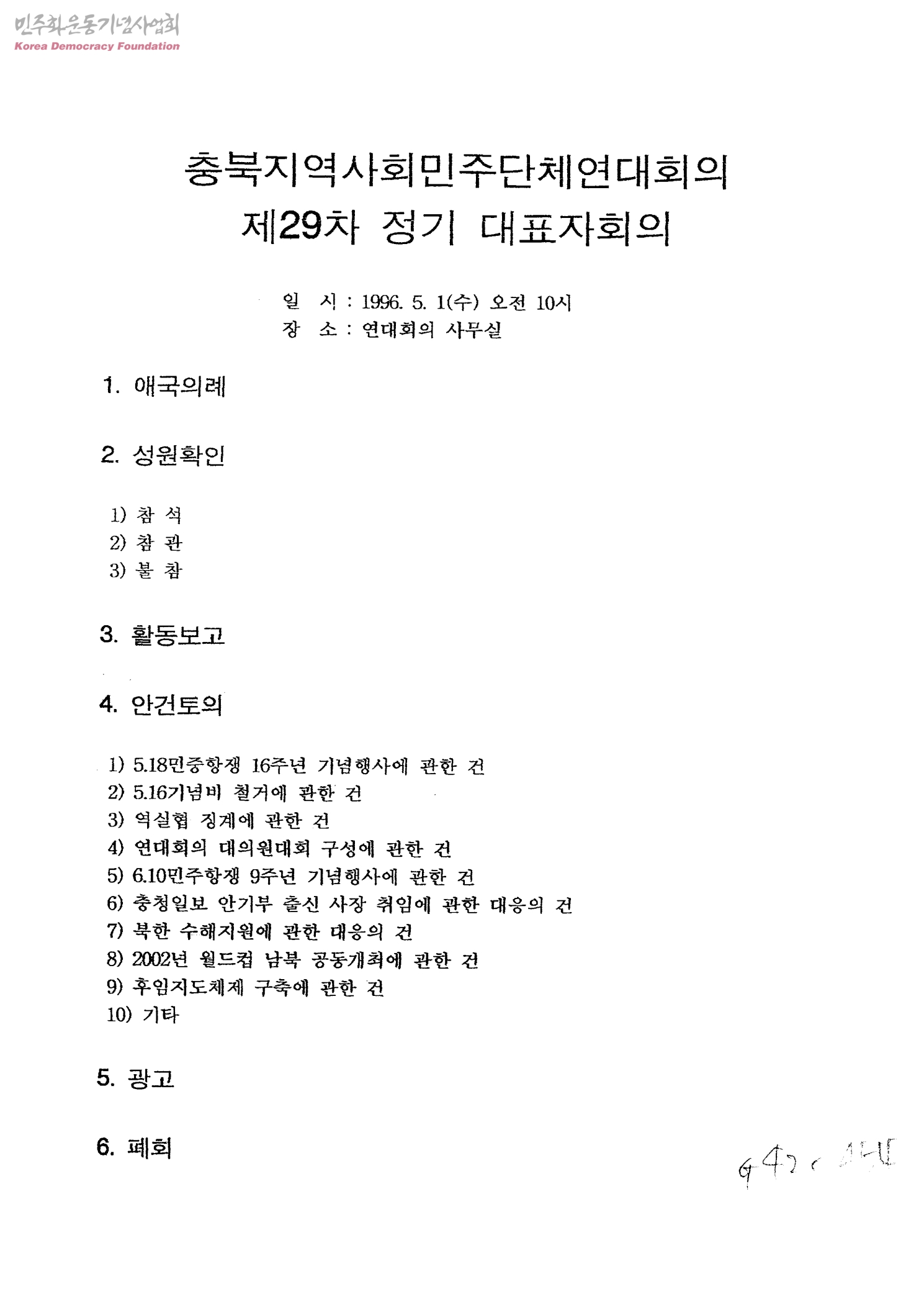 - <안건토의> 1)5.18민중항쟁 16주년 기념행사에 관한 건 2)5.16기념비 철거에 관한 건 3)역실협 징계에 관한 건 4)연대회의 대의원대회 구성에 관한 건 5)6.10민주항쟁 9주년 기념행사에 관한 건 6)충청일보 안기부 출신 사장 취임에 관한 대응의 건 7)북한 수해지원에 관한 대응의 건 8)2002년 월드컵 남북 공동개최에 관한 건 9)후임지도체제 구축에 관한 건 10)기타