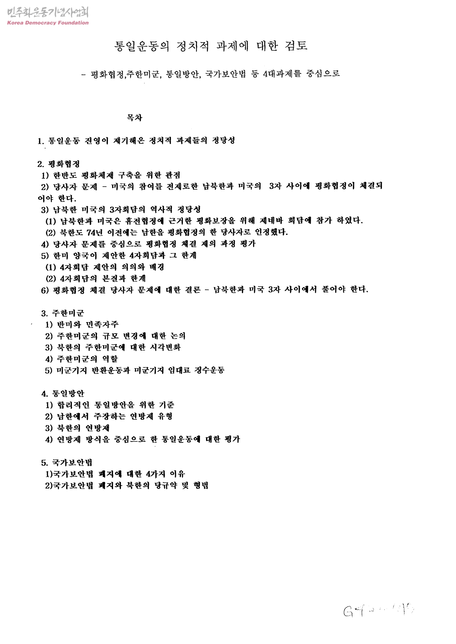 - 1.통일운동 진영이 제기해온 정치적 과제들의 정당성 2.평화협정 3.주한미군 4.통일방안 5.국가보안법