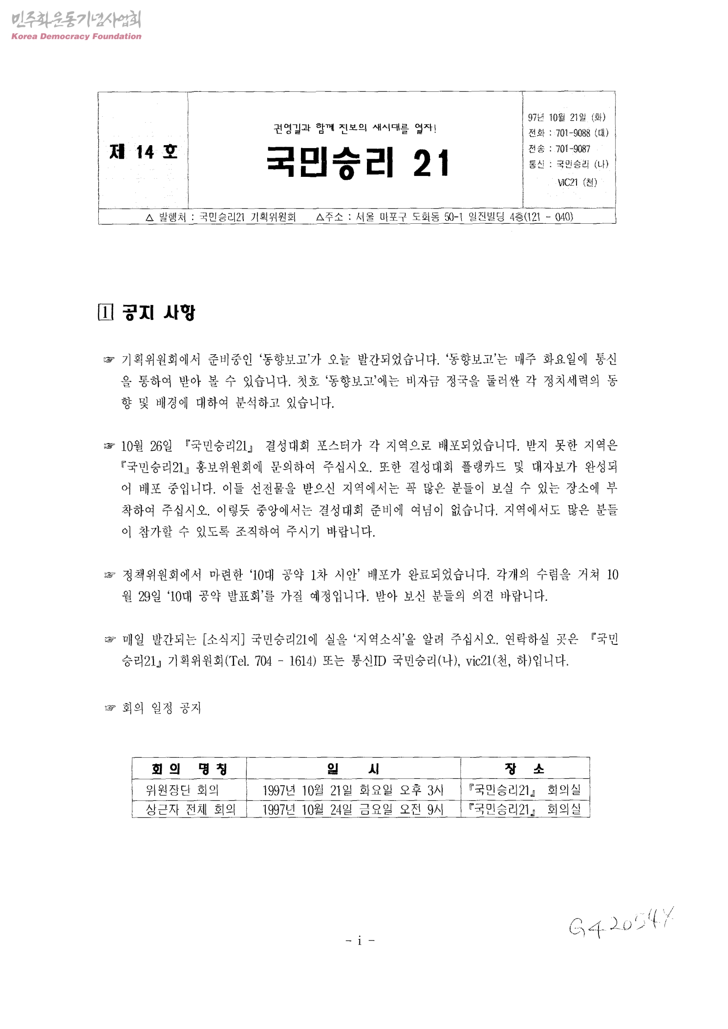 - 1.공지사항 2.후보동정 3.부서소개 4.논평 -여,야 합작의 "날림 국정감사"를 비판한다 -흑자기업 바로크가구의 부도를 걱정한다 5.기타자료 -권영길 후보의 'PC 통신 토론'참가에 관한 국민승리21의 의견