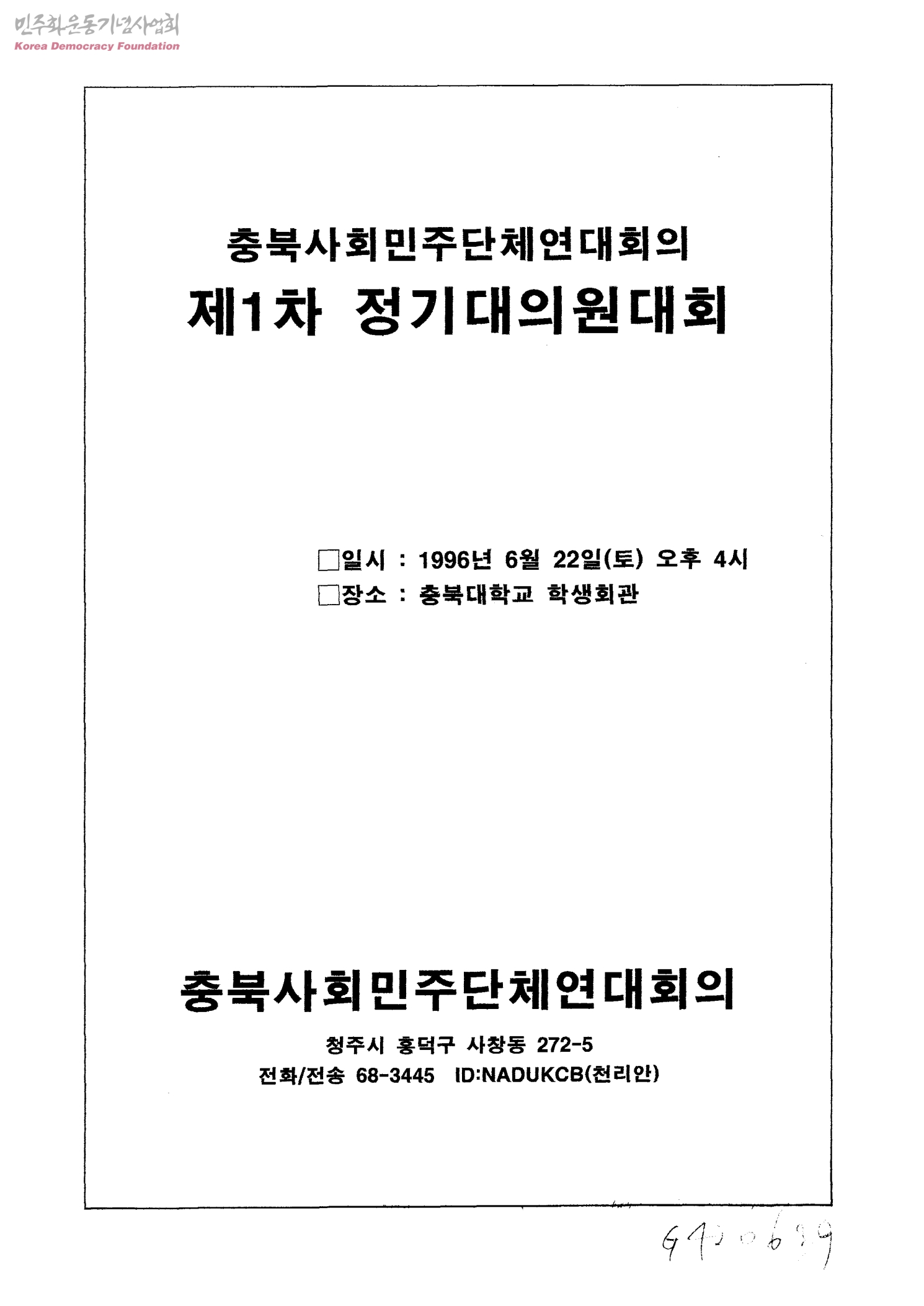 - 1)대회사 2)격려사 3)안건 -의장단 및 감사 선출의 건 -운영위원에 구성에 관한 건 -사업보고 및 사업승인에 관한 건 4)6월민주항쟁 10주년 충북 기념사업위원회 구성(안) 5)결의문 6)강령 및 규약 7)대의원 명단