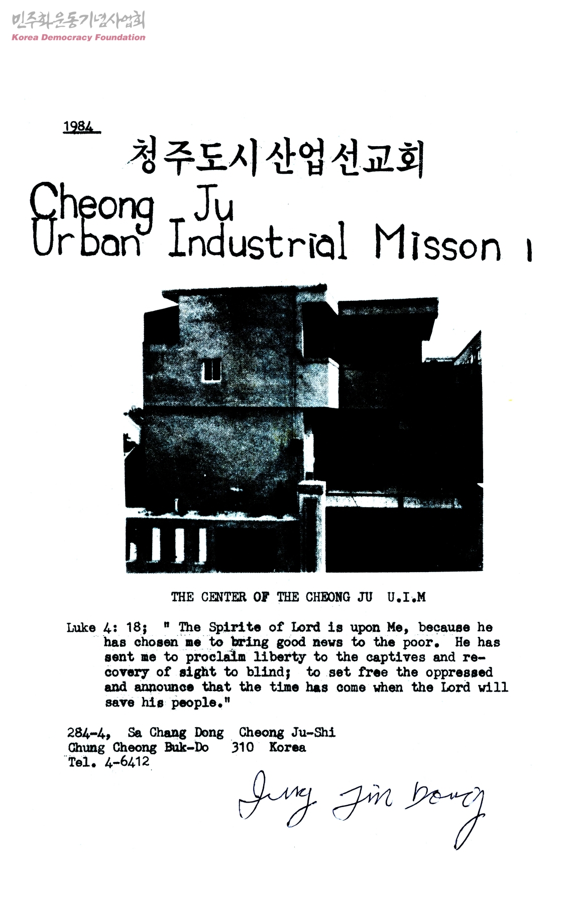 - 1.Visiting The Urban Industrial Mission 2.The official Address of the Cheong Ju U.I.M 3.Foreword 4.A Spirit of the Bible in Cheong Ju UIM 5.Activities and Operation 6.Auxilliary Organization 7.Educational System 8.Contents of Cheong Ju UIM Schedule 9.Today, the Way of All Churches In Korea 10.Labor Satndard Act Sommary 11.Cheong Ju U.I.M Mistorical Career