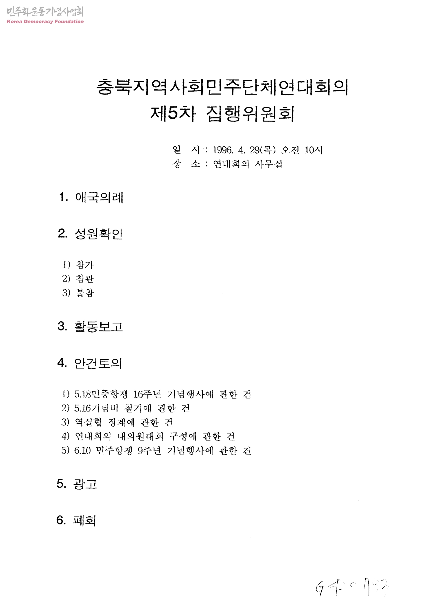 - <안건> 1)5.18민중항쟁 16주년 기념행사에 관한건 2)5.16기념비 철거에 관한 건 3)역실협 징계에 관한건 4)연대회의 대의원대회 구성에 관한건 5)6.10 민주항쟁 9주년 기념행사에 관한 건 <첨부> 1)제4차 임시 집행위원회 결과 2)5.18민중항생 16주년 기념행사 계획(안)