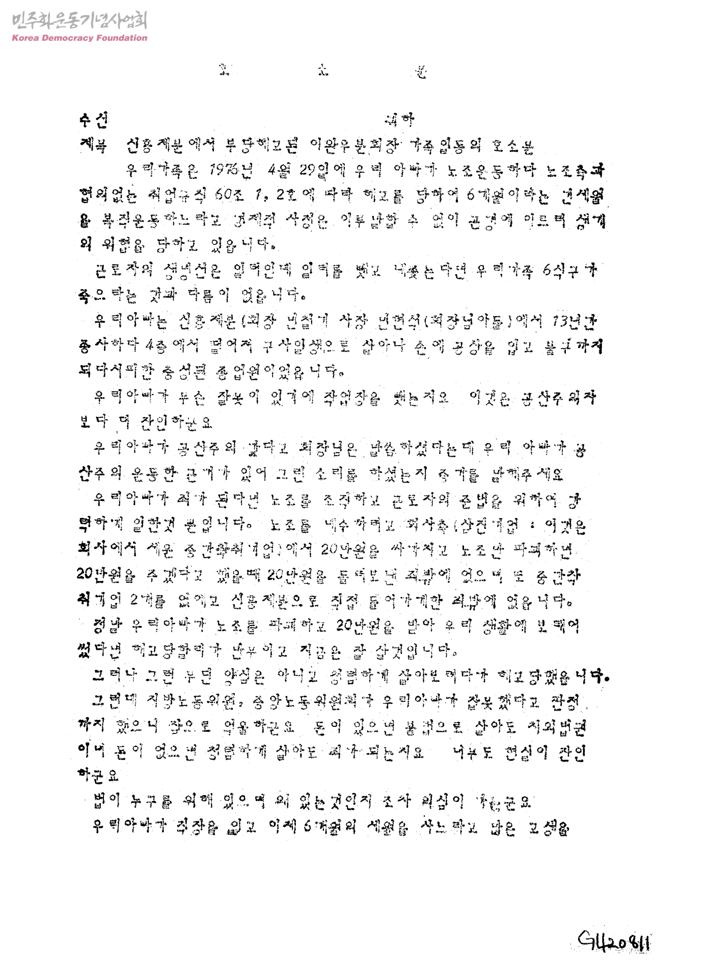호소문-신흥제분에서 부당해고된 이완우분회장 가족 일동의 호소문