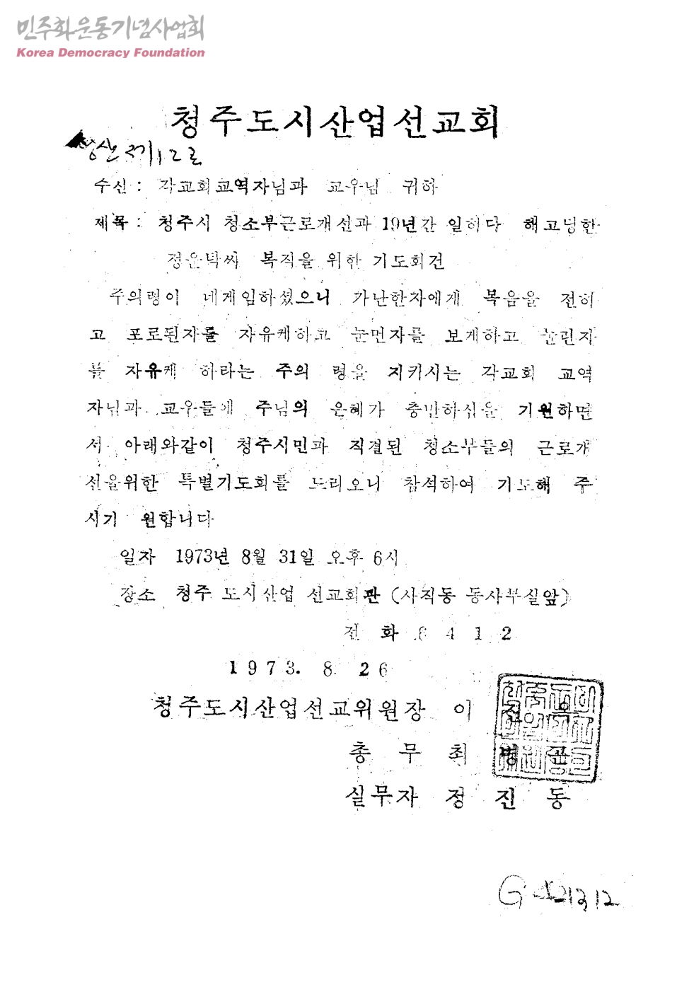 청주시 청소부근로개선과 19년간 일하다 해고당한 정운탁씨 복직을 위한 기도회건[수신:각교회교역자님과 교우님]