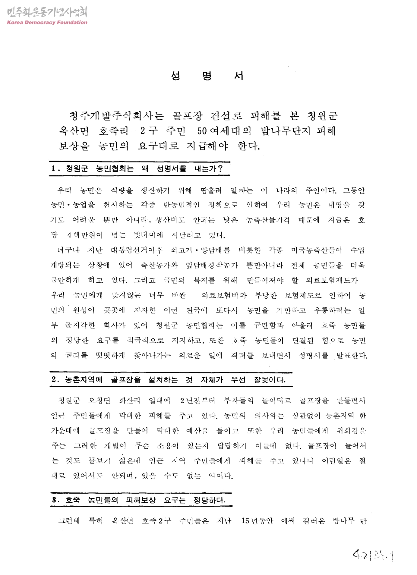 성명서-청주개발주식회사는 골프장 건설로 피해를 본 청원군 옥산면 호죽리 2구 주민 50여세대의 밤나무단지 피해 보상을 농민의 요구대로 지급해야 한다.