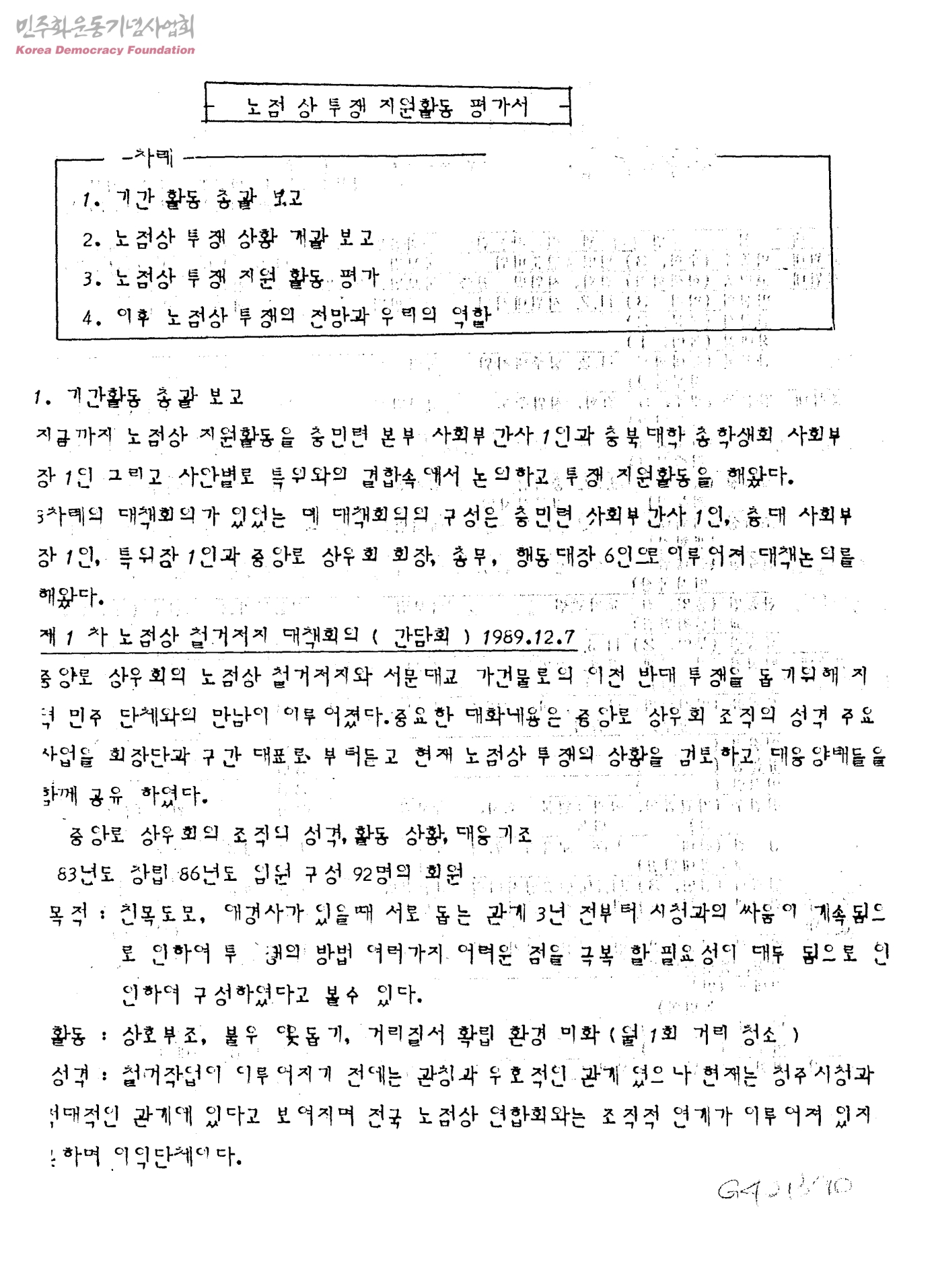 - 1.기간 활동 총괄 보고 2.노점상 투쟁 상황 개괄 보고 3.노점상 투쟁 지원 활동 평가 4.이후 노점상 투쟁의 전망과 우리의 역할