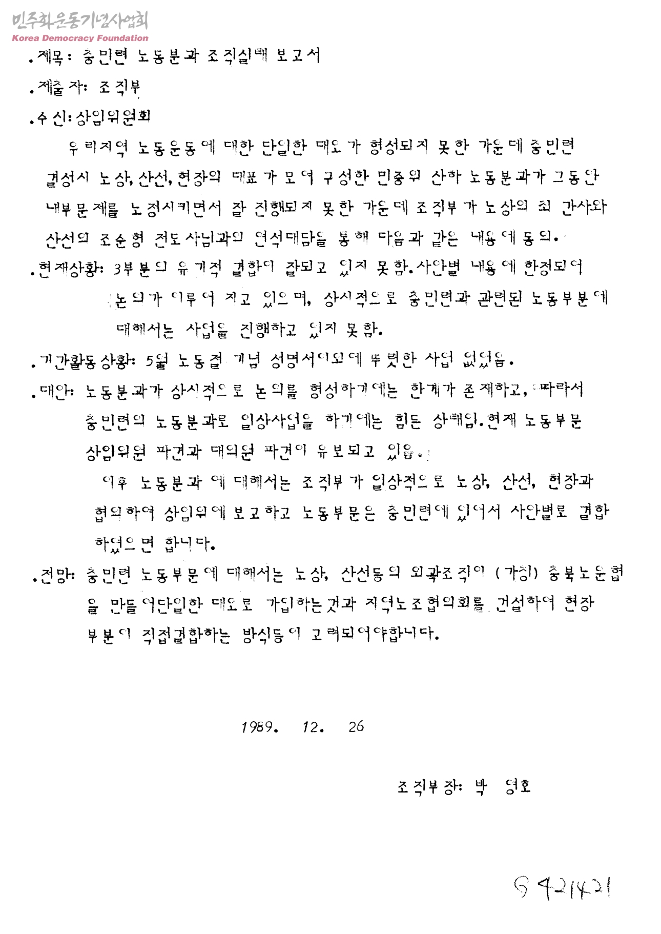 충민련 노동분과 조직실태 보고서[수신:충북민족민주운동연합상임위원회,발신:충북민족민주운동연합조직부]