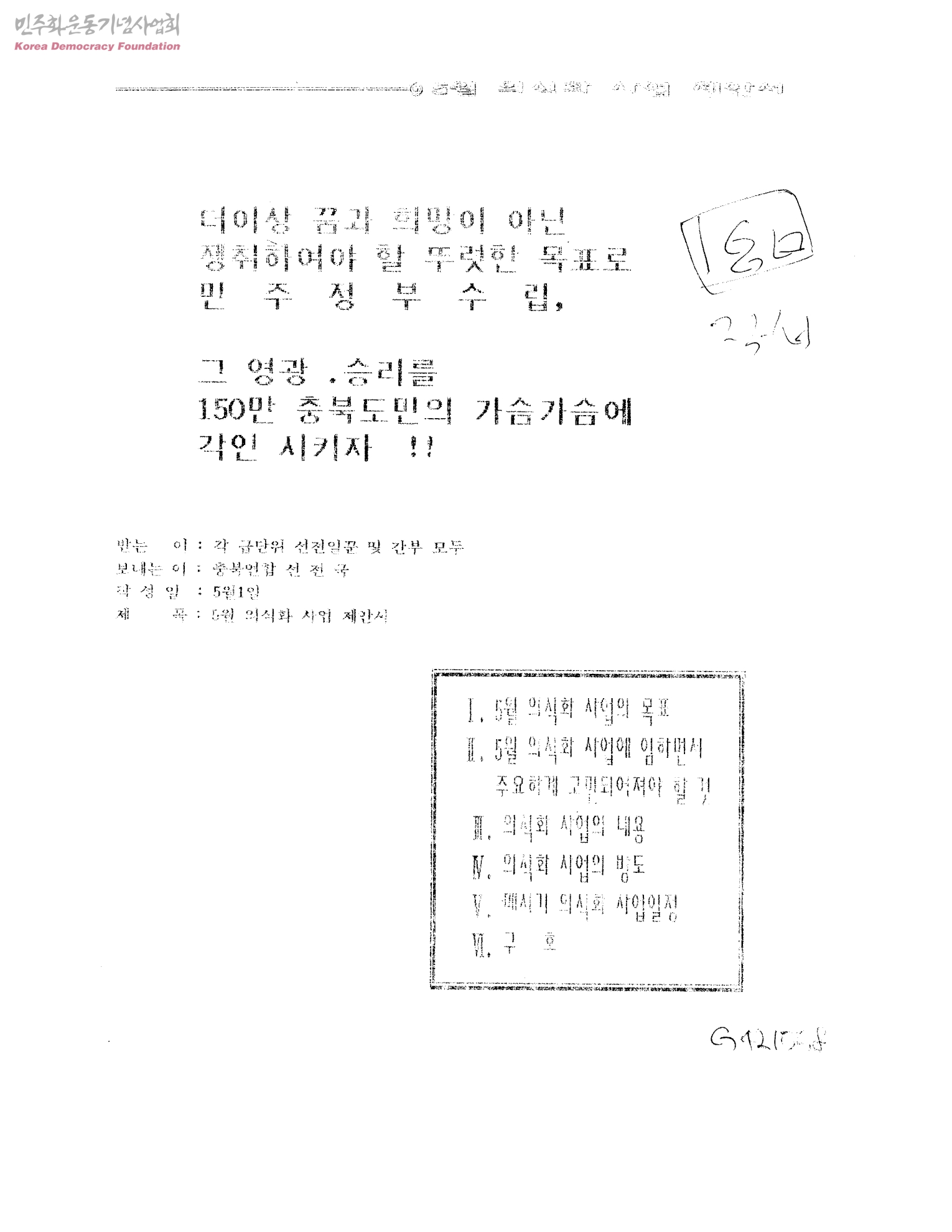 - 더이상 꿈과 희방이 아닌 쟁취하여야 할 뚜렷한 목표로 민주정부수립, 그 영광, 승리를 150만 충북도민의 가슴가슴에 각인시키자! 1.5월 의식화 사업의 목표 2.5월 의식화 사업에 임하면서 주요하게 고민되어져야 할 것 3.의식화 사업의 내용 4.의식화 사업의 방도 5.매시기 의시고하 사업일정 6.구호